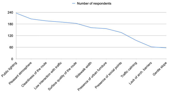 The data exposed in Figure 4 reveals that public lighting (236 responses), pleasant atmosphere (206) and cleanliness of the route (196) were the three most important aspects mentioned by residents. These were closely followed by low interaction with traffic (190) and the quality of the route surface (183). It is worth noting that aspects such as the lack of architectural barriers (62) and gentle slope (57), essential for people with reduced mobility, were ranked last, suggesting that these needs are poorly recognized by the general population. This discrepancy highlights the importance of differentiated assessment strategies that take into account the diversity of users and highlights a gap between dominant perceptions and the specific barriers encountered by people with disabilities.