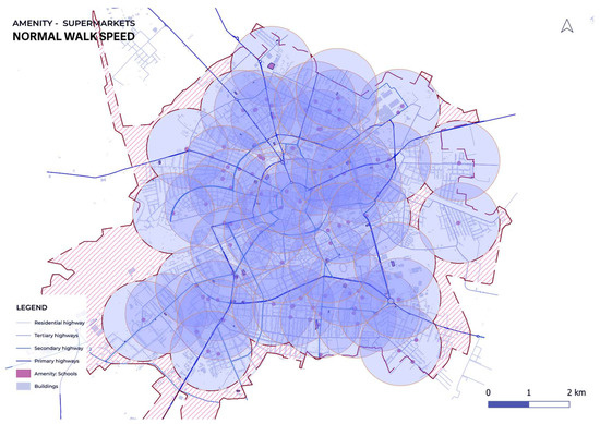 Figure 5. Spatial coverage of supermarkets (Normal-speed walk—15 min), source: author’s elaboration; data: OpenStreetMap contributors.