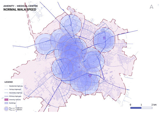 Figure 6. Spatial coverage of medical centers (Normal-speed walk—15 min), source: author’s elaboration; data: OpenStreetMap contributors. - Reduced-speed walking (SSW): calculated for the same time interval (15 min) but adjusted to a shorter distance, based on a reduced speed of approximately 0.8 m/s, reflecting average conditions for people with mobility or visual impairments [36,37] (Figure 7 and Figure 8).