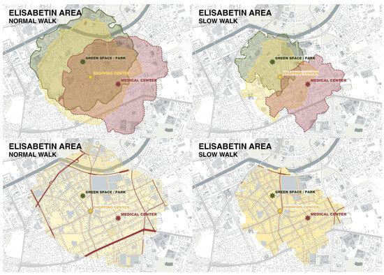 Walking accessibility in Elisabetin area to commercial, medical and recreational destinations within 15 min, by normal and slow walking speeds.