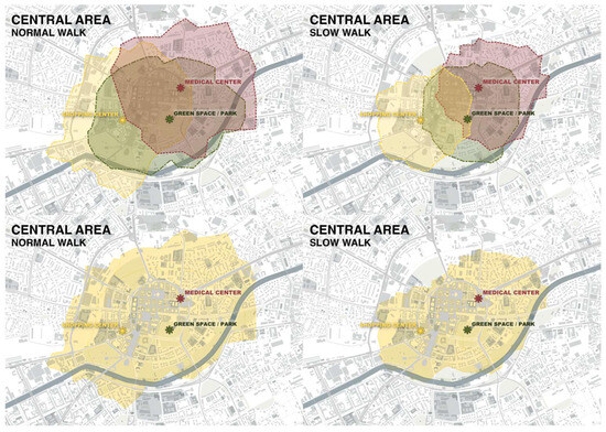 Walking accessibility in Central area to commercial, medical and recreational destinations within 15 min, by normal and slow walking speeds.