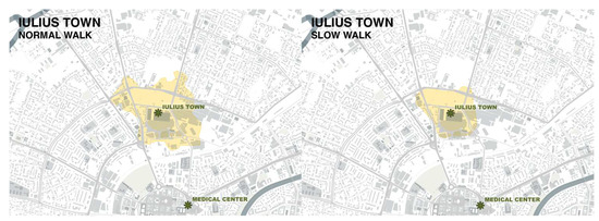 Walking accessibility in Iulius Town area, within 15 min, by normal and slow walking speeds.