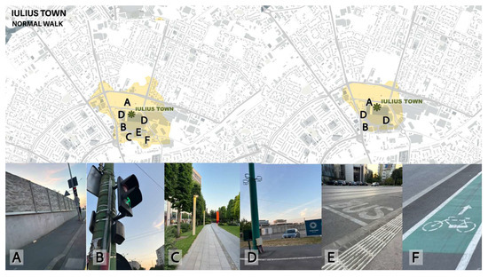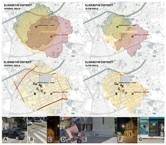 Accessibility Evaluation in the Iulius Town Based on Proximity and On-Site Observations for Normal and Slow Walking Speeds; (A) cleanliness, (B) audible traffic signals at crossing, (C,E) tactile paving, (D) obstacle sidewalks, (F) unclear tactile demarcated bike line. Source: author’s elaboration; data: OpenStreetMap contributors, TraveTime API.