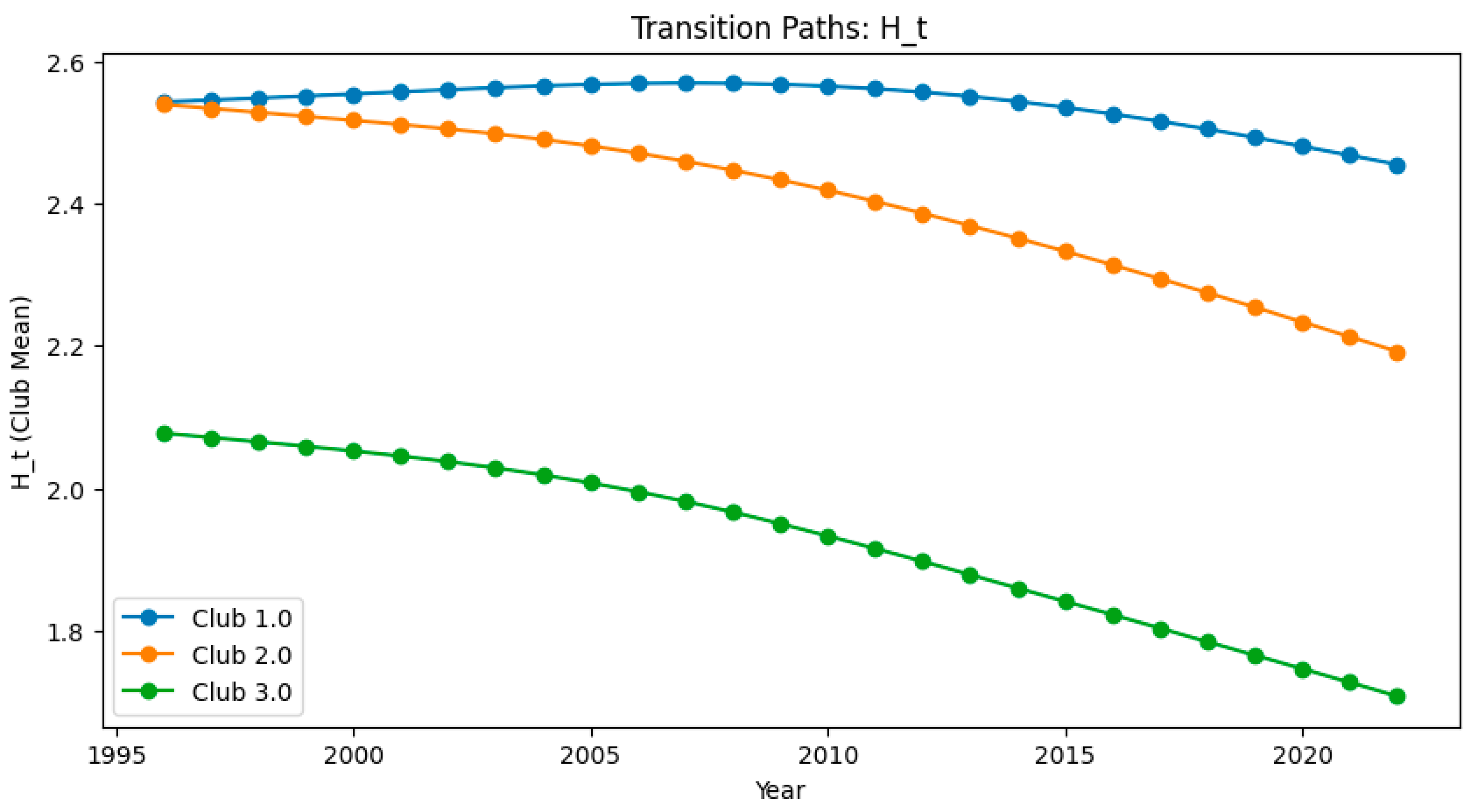 | Variable | Club 2 (Coefficient (p-Value)) | Club 3 (Coefficient (p-Value)) |