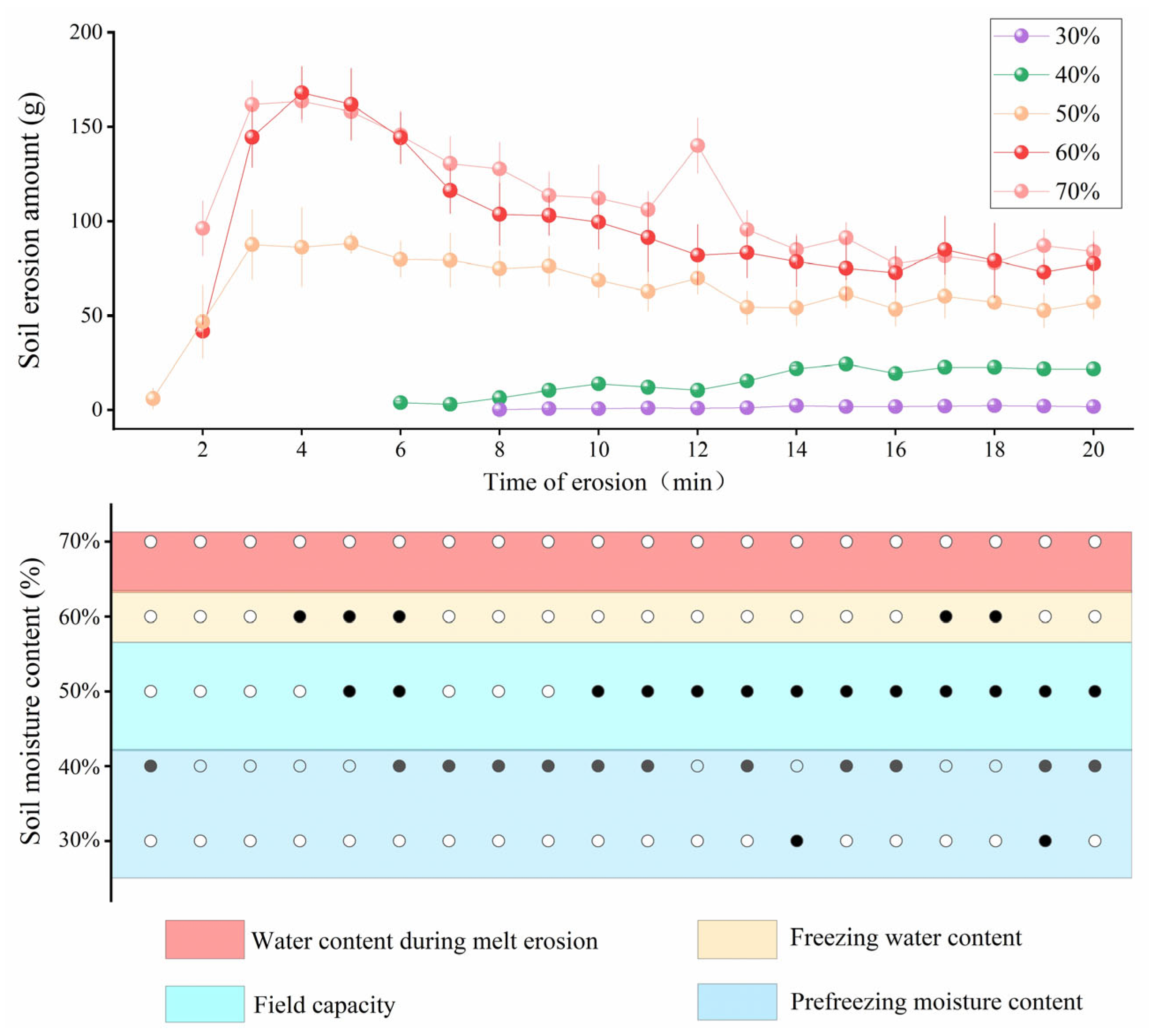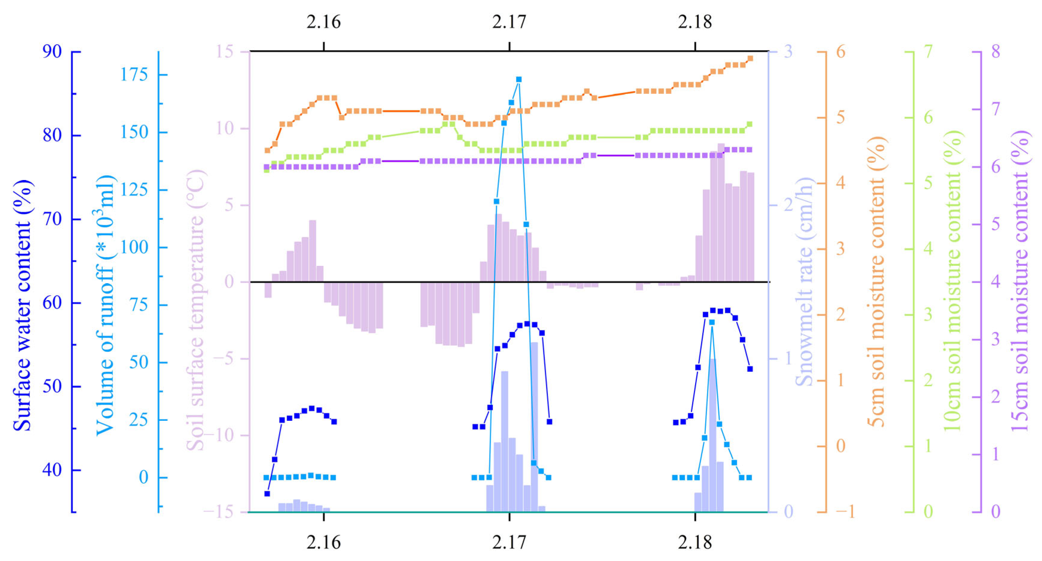 - Bai, Q.; Zhou, L.; Fan, H.; Huang, D.; Yang, D.; Liu, H. Effects of Frozen Layer on Composite Erosion of Snowmelt and Rainfall in the Typical Black Soil of Northeast China. Water 2024, 16, 2131. [Google Scholar] [CrossRef]
