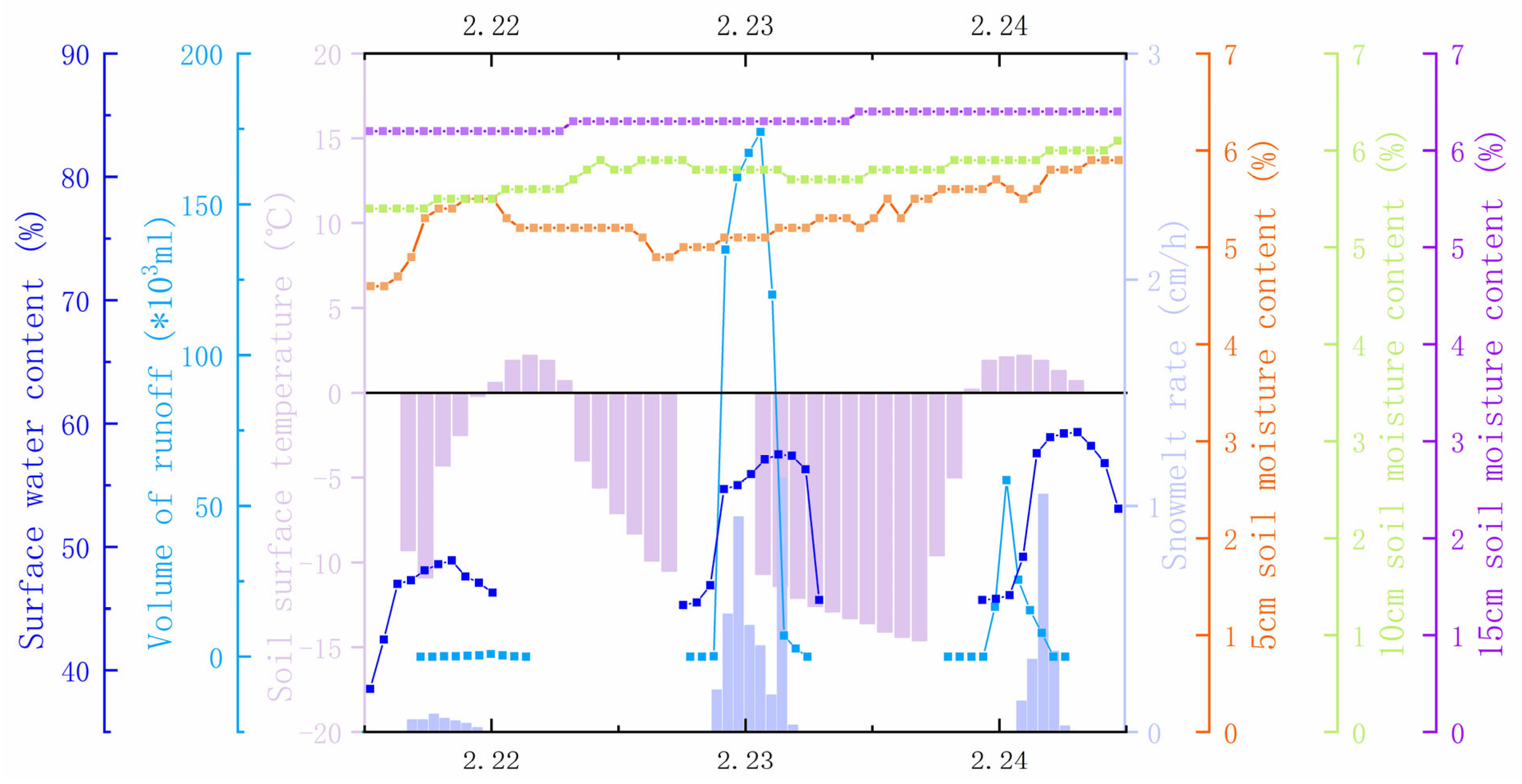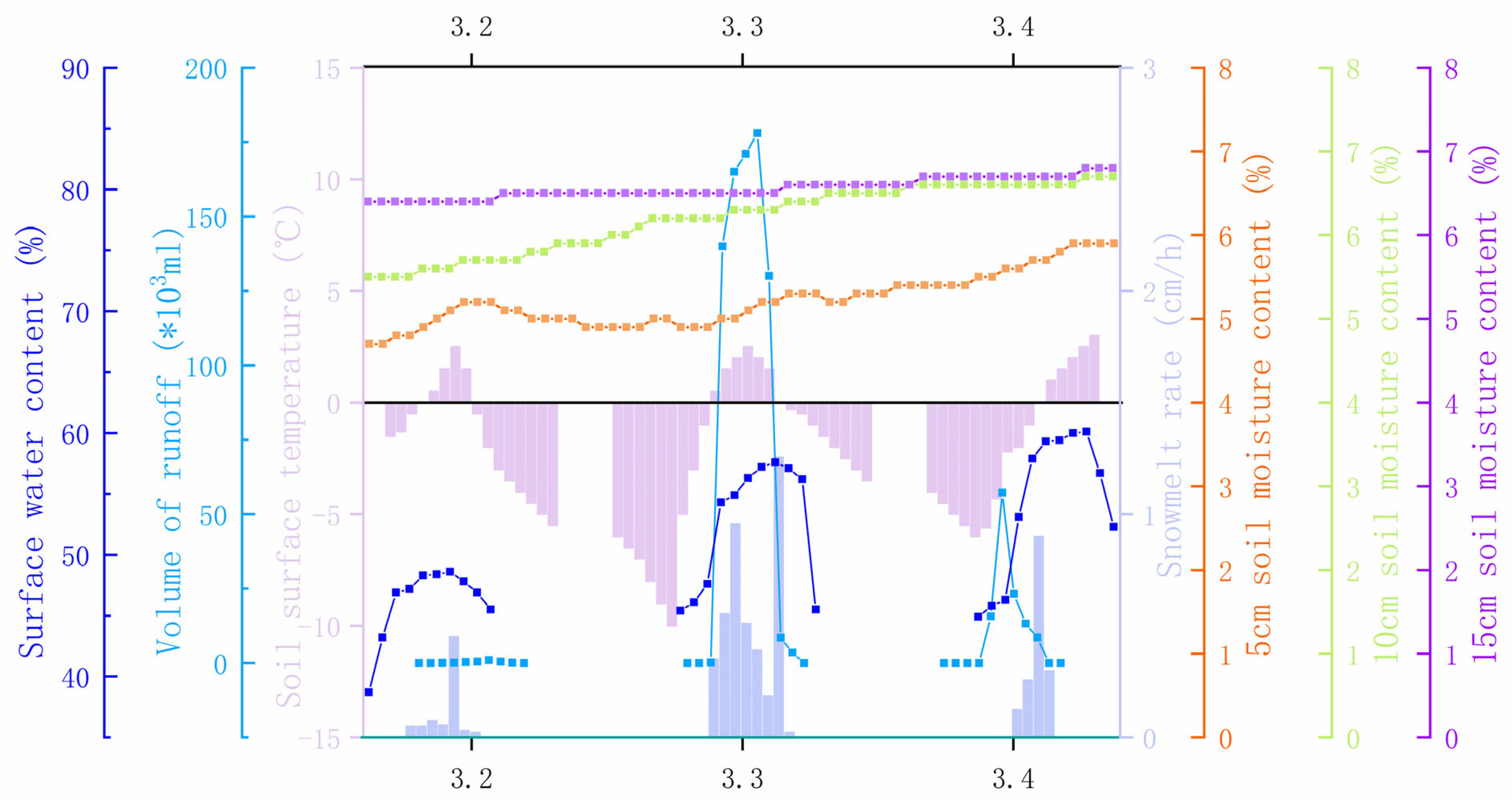 - Fan, H.; Hou, Y.; Xu, X.; Mi, C.; Shi, H. Composite factors during snowmelt erosion of farmland in black soil region of northeast China: Temperature, snowmelt runoff, thaw depths and contour ridge culture. Water 2023, 15, 2918. [Google Scholar] [CrossRef]