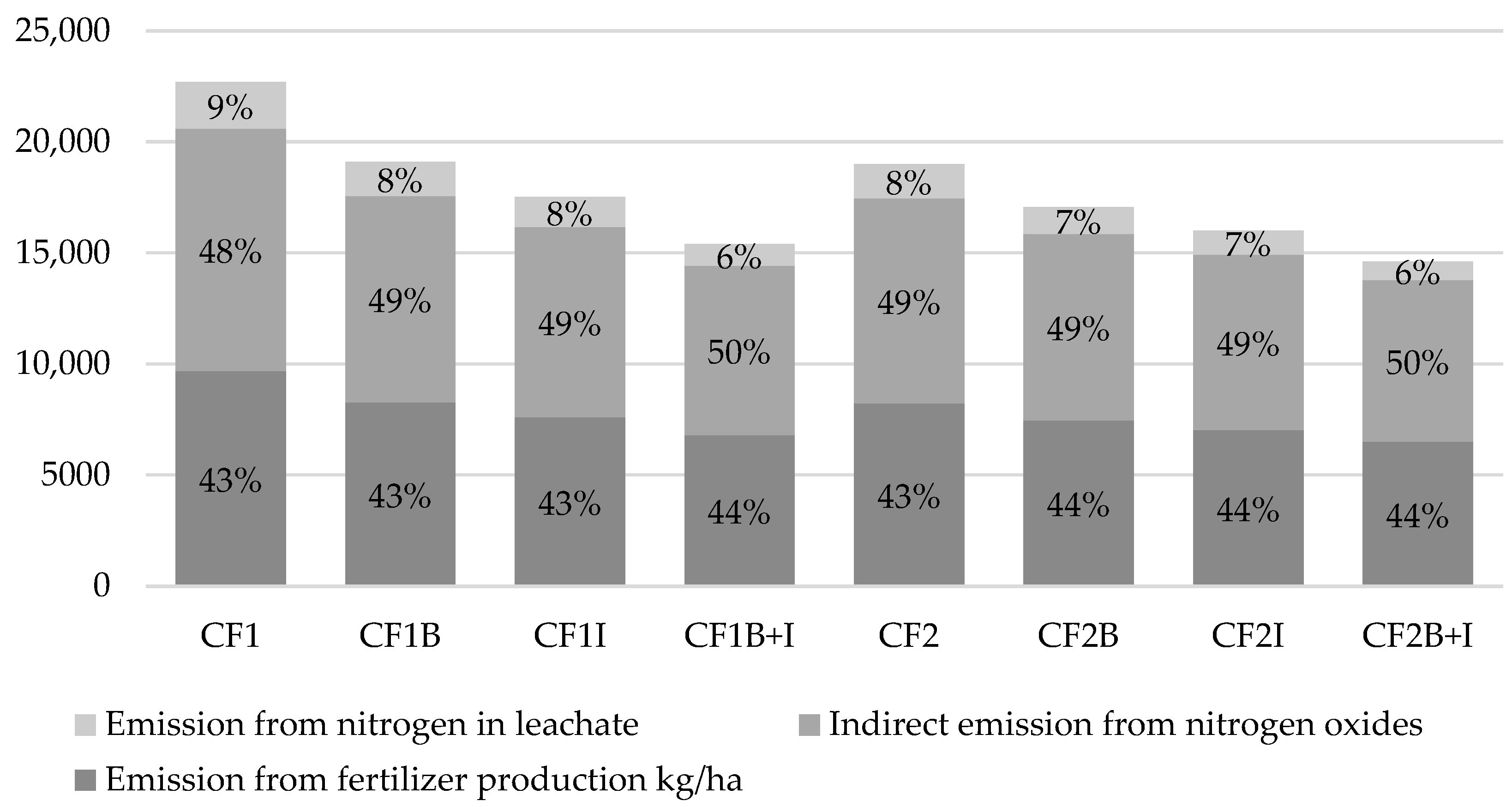 Object | Emissions from Fertilizer Production [CO2-eq/ha] | Indirect Emissions from Nitrogen Oxides [CO2-eq/ha] | Emissions from Nitrogen in Leachate [CO2-eq/ha] | GHG Emissions from Fertilization [CO2-eq/ha] | GHG Emissions from Fertilization [CO2-eq/kg of Yield] |
