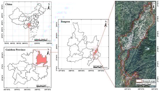 Tongren City is situated in northeastern Guizhou Province, within a transitional zone between the Yunnan-Guizhou Plateau and the Xiangxi Hilly Region of southwestern China [27]. Its geographical coordinates span 107°45′–109°39′ E longitude and 27°07′–29°05′ N latitude [28]. The city has undergone rapid development in recent years, with its permanent resident population reaching 3.2137 million and the urbanization rate attaining 48% by the end of 2023 [29]. Tongren features a predominantly mountainous terrain with pronounced undulation, where mountainous regions constitute 67.8% of the total urban area. Karst landscapes span 10,965 km2, accounting for approximately 61% of the city’s land [30]. Tongren experiences a subtropical monsoon humid climate characterized by significant spatial heterogeneity in weather patterns owing to its complex topography [27,30]. Tongren’s tourism industry, functioning as a leading economic sector, exhibits significant sensitivity to seasonal climatic variations due to the region’s distinctive geographical setting and rich ecological endowments [31]. The annual average temperature ranges from 13.8 to 17.8 °C, with record highs peaking at 42 °C in August and extreme lows reaching −9.4 °C in January [32]. During summer (June–August), prolonged rainless periods result in a summer drought probability of 84–94% across Tongren, averaging approximately 88% [33]. This climatic profile renders Tongren highly suitable for urban heat island (UHI) effect studies. Consequently, the central urban area—covering 344.75 km2—was designated as the focal research zone (Figure 1).