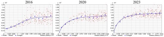 Grid scale critically influences thermal environment studies [35], with Oke’s research [36] establishing that optimal Local Climate Zone (LCZ) spatial resolution requires a minimum diameter of 400–1000 m following scale effect analysis. Given variations in urban architectural morphology, cities exhibit distinct LCZ resolution requirements [37]. Consequently, this study employs the ordinary kriging model—a geostatistical method for spatial structure modeling and feature analysis—to perform semi-variogram analysis, defined by the following formulas: