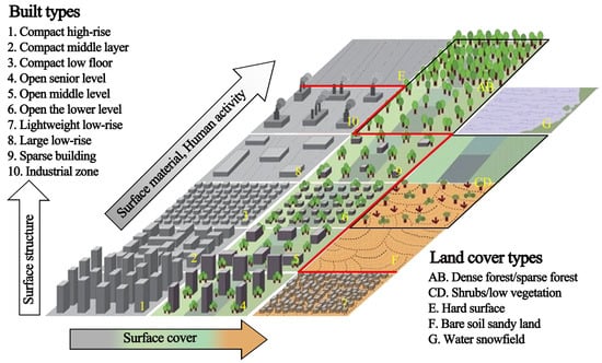Through localized research, the framework of the local climate zoning (LCZ) classification system in Tongren City was optimized, with modifications applied to specific parameters in the standard system [7] for targeted adjustments. As shown in Figure 4, the 15-category classification comprises five land cover types and ten building types. The building types include LCZ-1 (Compact high-rise), which is a densely distributed high-rise building. The building materials are mainly glass curtain walls and concrete, and the vegetation is scarce. LCZ-2 (Compact middle layer) is a middle-floor terraced building, mainly using a brick–concrete structure, with limited courtyard space. LCZ-3 (Compact low floor) is a dense collection of low and traditional residential buildings with small building spacing and mostly paved ground. LCZ-4 (Open senior level) is a high-rise building with a scattered layout, surrounded by green spaces and parking lots. LCZ-5 (Open middle level) is a combination of medium-height buildings and courtyards, with relatively rich vegetation coverage. LCZ-6 (Open lower level) is a sparsely distributed single-family low-rise residential complex with a high proportion of surrounding green space. LCZ-7 (Lightweight low-rise) is a shed or temporary building constructed with simple materials, and its roof is mostly made of metal or asphalt. LCZ-8 (Large low-rise) is a single-story large-scale building, commonly found in warehouses and shopping malls, with roofs made of metal or asphalt materials. LCZ-9 (Sparsely building) are independent buildings scattered on the natural surface, mainly surrounded by bare soil or vegetation. LCZ-10 (Industrial zone) is characterized by factories, chimneys, and hardened sites, with sparse vegetation and a large heat capacity. This classification effectively depicts the physical structure and thermal characteristics of the underlying surface of Tongren City. The types of land cover include LCZ-AB (Dense/sparse forest), LCZ-CD (Shrubs/low vegetation), LCZ-E (Hard surface), LCZ-F (Bare soil sandy land), and LCZ-G (Water snowfield). This classification precisely characterizes the physical properties of urban underlying surfaces, providing a clear framework for analyzing their thermal environmental effects. This adjustment enhanced the system’s applicability to Tongren’s mountainous urban morphology.