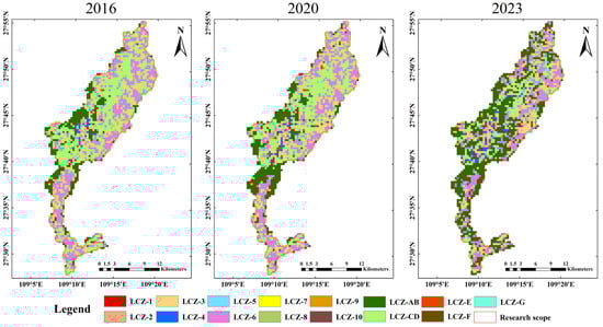 Spatial variations of local climate zone types in Tongren City from 2016 to 2023.