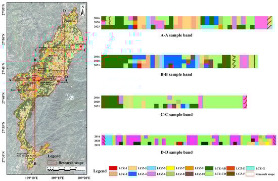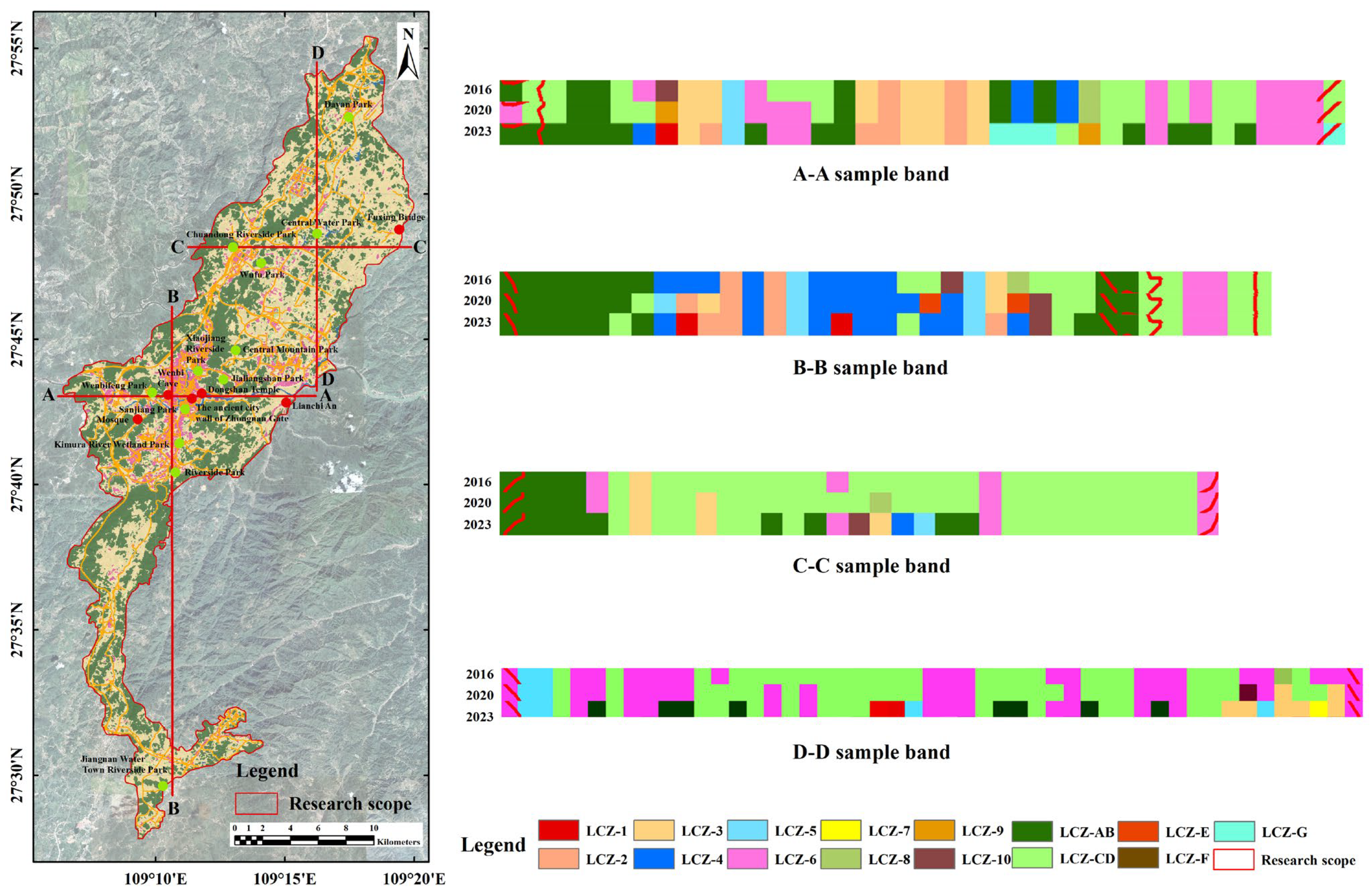 As illustrated in Figure 6, four representative sample transects were selected to analyze the spatial evolution of local climate zones (LCZ) types. The A-A transect traverses east–west along the main river, capturing river-aligned urban development. The B-B transect extends north–south from the Xiaojiang River to Xieqiao, reflecting terrain-constrained development patterns. The C-C transect crosses east–west between Chuandong and Liangwan, representing fringe expansion dynamics. Finally, the D-D transect follows a north–south orientation from Daxing to Dengta, demonstrating transportation corridor-driven urbanization.