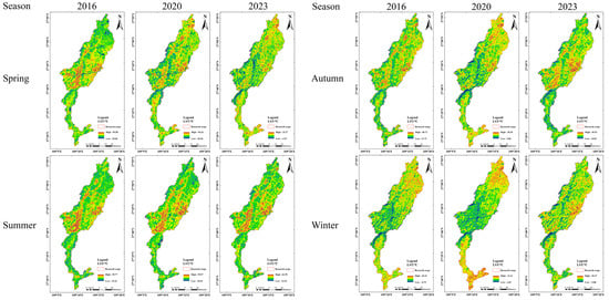 Figure 7 illustrates the spatio-temporal evolution of the urban heat island (UHI) effect in Tongren City’s core area, transitioning from a patchy single-core pattern in 2016 to multi-core aggregation by 2022, and subsequently fragmenting in 2023. The persistent summer high temperatures reflect pronounced urban heat storage effects. Winter cold islands in western mountainous areas maintained 30% coverage stability through 2022 but expanded by 27.8% in 2023, forming distinct cold-air intrusion corridors that permeate urban fringes. Autumn exhibits a fragmented equilibrium dominated by mesothermal transition zones, indicating a dual-process thermal regime characterized by constrained core warming and amplified peripheral cooling.
