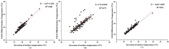 Verification of surface temperature inversion results based on Landsat data. Among them, (a) the verification of Landsat7 in the spring of 2023; (b) the verification of Landsat7 in the fall of 2016; (c) the verification of Landsat7 in winter 2016.