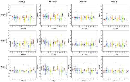 Here, denotes the surface urban heat island intensity (°C), represents the land surface temperature (°C) of each LCZ type, and signifies the spatially averaged reference temperature (°C) across the study area.