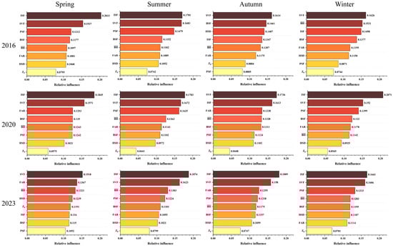 Figure 10 reveals a transformational trend in the driving mechanisms of Tongren City’s surface urban heat island intensity (SUHII) from 2016 to 2023, characterized by a shift from two-dimensional surface hardening dominance to three-dimensional spatial form regulation. In 2016, surface coverage parameters prevailed, with impervious surface fraction (ISF) contributing 30–40% at its peak—highlighting surface hardening as the primary urbanization-driven heat island driver. Building surface fraction (BSF) and floor area ratio (FAR) followed at 20–25%, reflecting volumetric expansion synergies in newly developed areas. By 2020, architectural form indicators gained prominence as BSF/FAR and ISF became co-dominant drivers, emphasizing the thermal influence of three-dimensional urban structures. The most significant transformation occurred in 2023 when sky view factor (SVF) and building height (planar surface fraction, PSF) contributions surged to 20–25%, surpassing ISF as the dominant forcing mechanism. Concurrently, pervious surface fraction (PSF) demonstrated enhanced mitigation effects, signaling an urban planning transition from suppressing land hardening to optimizing three-dimensional ventilation efficiency.