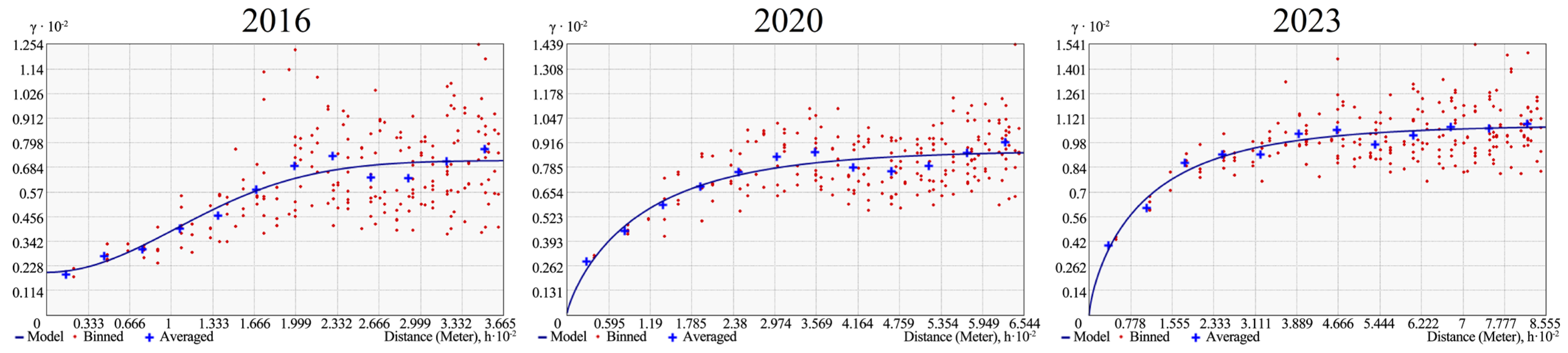 In this formulation, the semi-variogram function γ(h) quantifies spatial autocorrelation by measuring value disparities between sample points separated by distance h, where Z(x) denotes the observed value at location x, Z(x + h) signifies the sample value at a position offset by h, and N(h) is defined as the count of sample pairs within distance h.