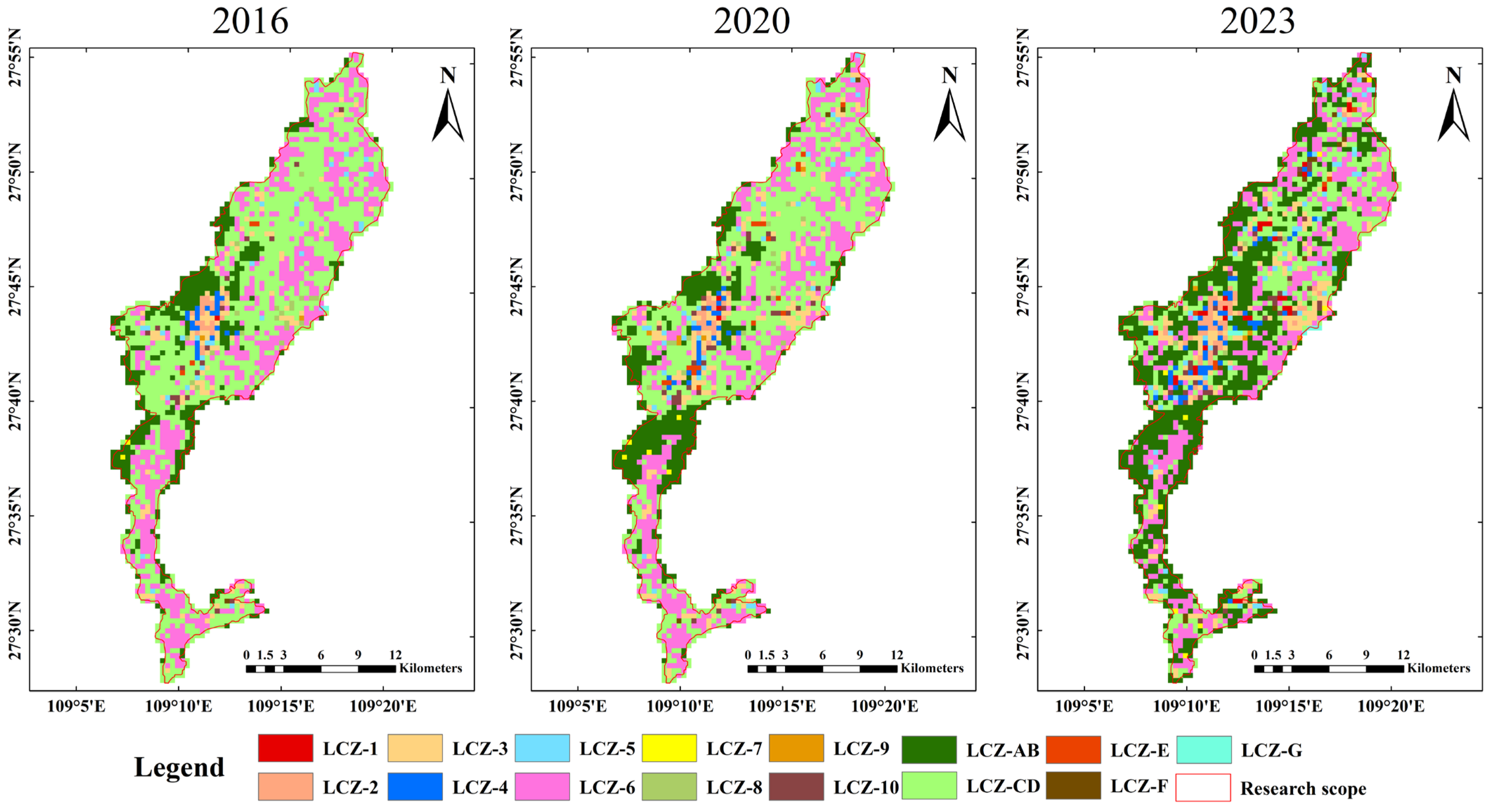 To evaluate the reliability of the classification results, the accuracy of the results was verified. The accuracy was evaluated by randomly generating verification points. We randomly generated several sample points, manually interpreted them by comparing with high-definition images (Google Earth), generated the confusion matrix and calculated the overall accuracy and Kappa coefficient. As shown in Appendix B, the Kappa coefficients of the LCZ classification results obtained through the confusion matrix in this study reached 0.93, 0.93, and 0.95, respectively, demonstrating extremely high and stable accuracy, all belonging to a high consistency level, which fully proves the effectiveness and robustness of this method.