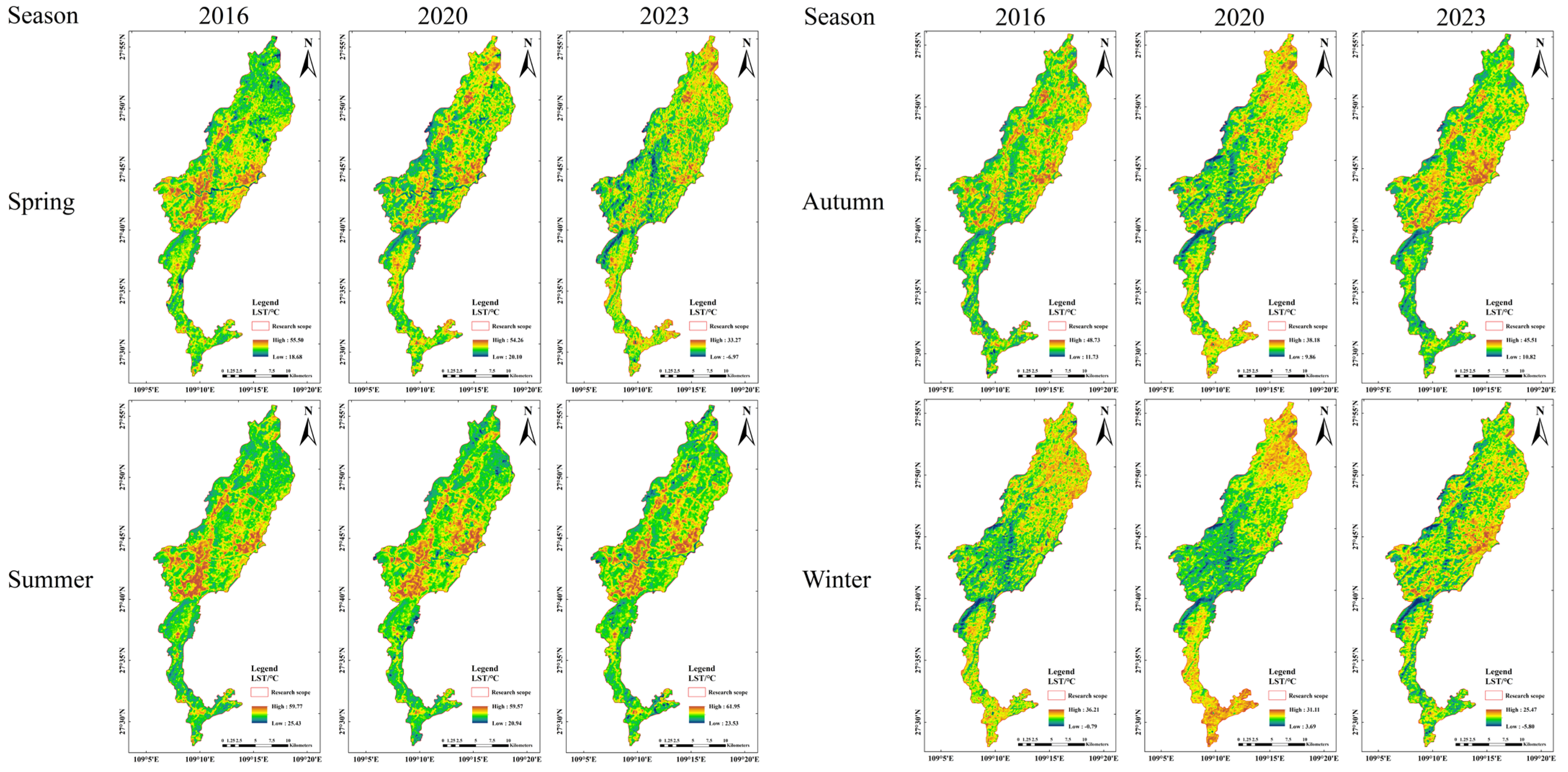 In this study, the corresponding algorithms mentioned above were used to invert the surface temperature (LST) of each period of remote sensing images, and finally, the raster charts of surface temperature in the study area for each period were generated. These temperature data are the core input data for the subsequent calculation of the heat island intensity.