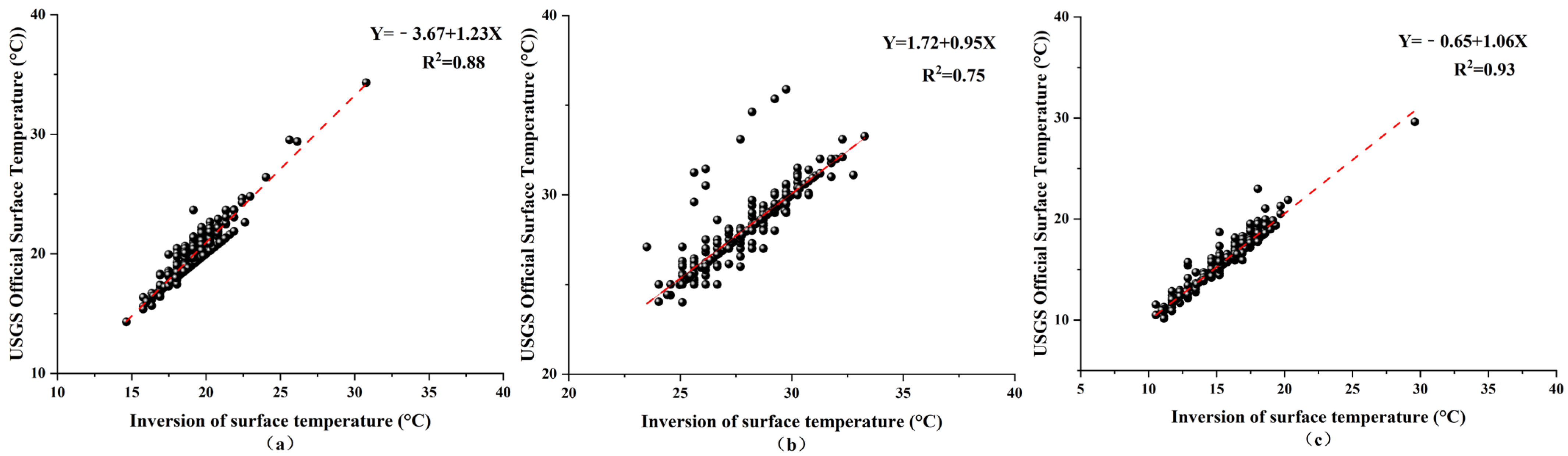 Figure 8. Verification of surface temperature inversion results based on Landsat data. Among them, (a) the verification of Landsat7 in the spring of 2023; (b) the verification of Landsat7 in the fall of 2016; (c) the verification of Landsat7 in winter 2016.