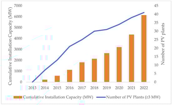 Photovoltaic systems represent a cost-effective means of generating renewable energy without emitting greenhouse gases. As of 2021, the capacity of global solar photovoltaic (PV) installations amounted to 942 GW, a dramatic contrast to the approximately 100 GW installed in 2012 [1,2], indicating a significant surge in the global deployment of PV systems. Chile, renowned for its high level of irradiation, stands out as one of the countries with immense potential for PV installation. Solar PV accounted for 18% of the country’s electricity production by 2022 [3]. Figure 1 illustrates a nearly six-fold increase in the number of PV plants in Chile, with an installation capacity greater than 3 MW, which rose from 7 to 41 between 2014 and 2022. Furthermore, the total installed capacity of PV power plants in the country reached 6142 MW by 2022 [4,5,6].