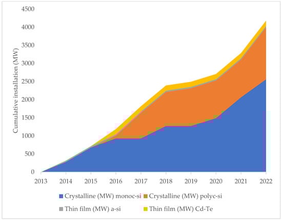 Furthermore, the type of PV module plays a crucial role in accurately estimating the amounts of extracted materials. Hence, it is essential to estimate expected waste flow according to the module types over the years. Figure 3 depicts the historical installations of solar PV plants in Chile categorized by PV module type. In this study, for each year, the ratio of PV waste is determined utilizing the Weibull distribution. Subsequently, the weight of the waste is calculated by multiplying the weight of each module type. Consequently, the waste flow is estimated for each year according to the module type.