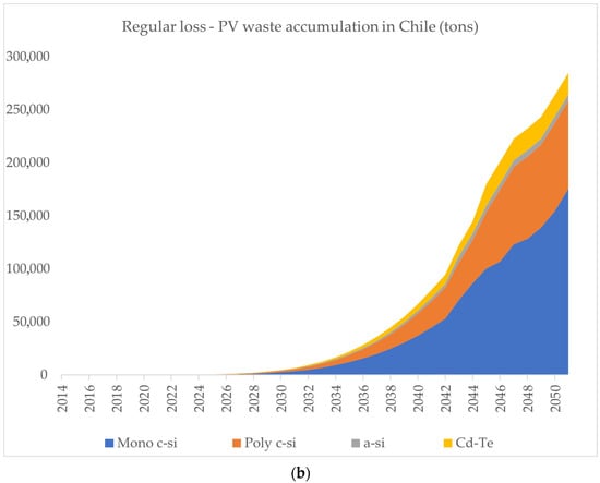The results indicate that the total expected solar PV module waste amounts to 284,906 tons, with 175,595 tons attributed to mono c-Si PV modules in Chile. The flow of photovoltaic module waste was derived using Weibull distribution modeling based on two scenarios: early-loss and regular-loss scenarios. In the early-loss scenario (Figure 4a), waste amounts are projected to reach 35,000 tons by 2030 and 100,000 tons by 2035. By 2040, approximately 40% of the installations, equivalent to 115,159 tons of PV module waste, are anticipated to reach the end of their lifespan. Notably, more than 55% of the waste is expected to be composed of mono c-Si PV module types by 2030 in this scenario. Conversely, in the regular-loss scenario (Figure 4b), waste amounts are estimated to reach 35,000 tons by 2037 and 100,000 tons by 2043. By 2040, nearly 24% of the installations, corresponding to 66,896 tons of PV module waste, are projected to phase out. Similar to the early-loss scenario, more than 55% of the PV module waste is projected to come from mono c-Si PV modules by 2040 in this scenario as well.