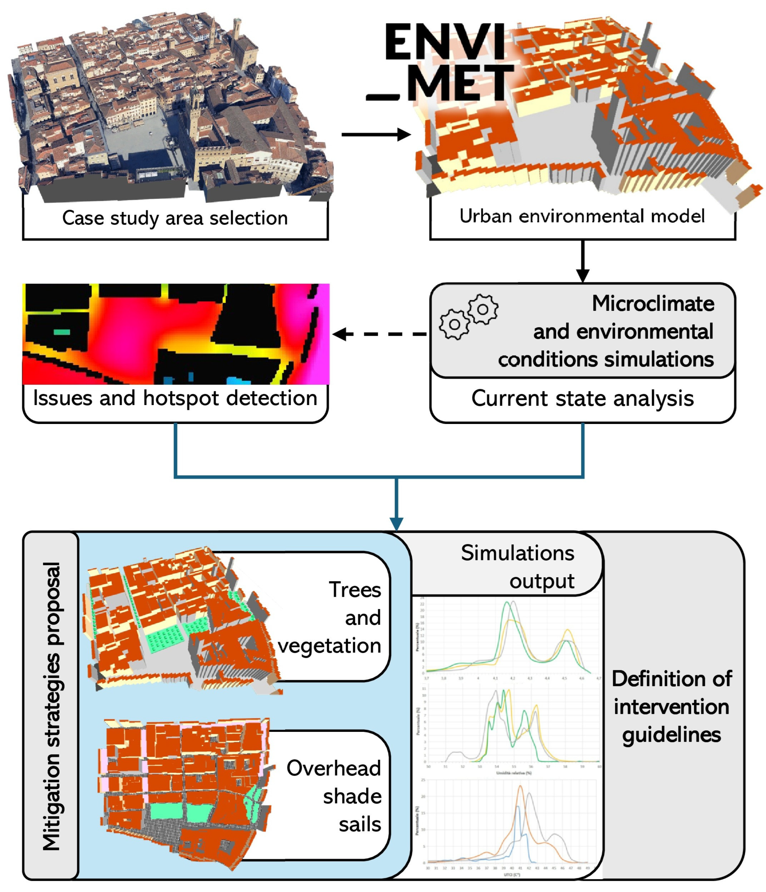 However, the proposed solutions in the current literature often fail to account for the unique constraints of historical urban environments. While a growing body of literature addresses UHI mitigation, a significant gap remains in developing and validating strategies suitable for heritage-sensitive, UNESCO-protected urban cores, and similar studies are not available for the Florentine context. UHI-related issues are in fact particularly relevant for heritage and monumental historical contexts, which need to balance the needs of cultural preservation and improving resilience to climate change. Such environments impose strict limitations that render conventional solutions like extensive green roofs or intervening in buildings’ finishing materials not feasible. Within this perspective, this contribution aims to evaluate the current comfort conditions experienced by pedestrians in the historical centre of Florence, performing dedicated environmental simulations using the ENVI-met software. The core novelty of this research lies in its focused application of microclimate modelling to evaluate context-specific, context-sensitive, and reversible UHI mitigation strategies within a globally significant, historically preserved, and pedestrian-dense urban environment.