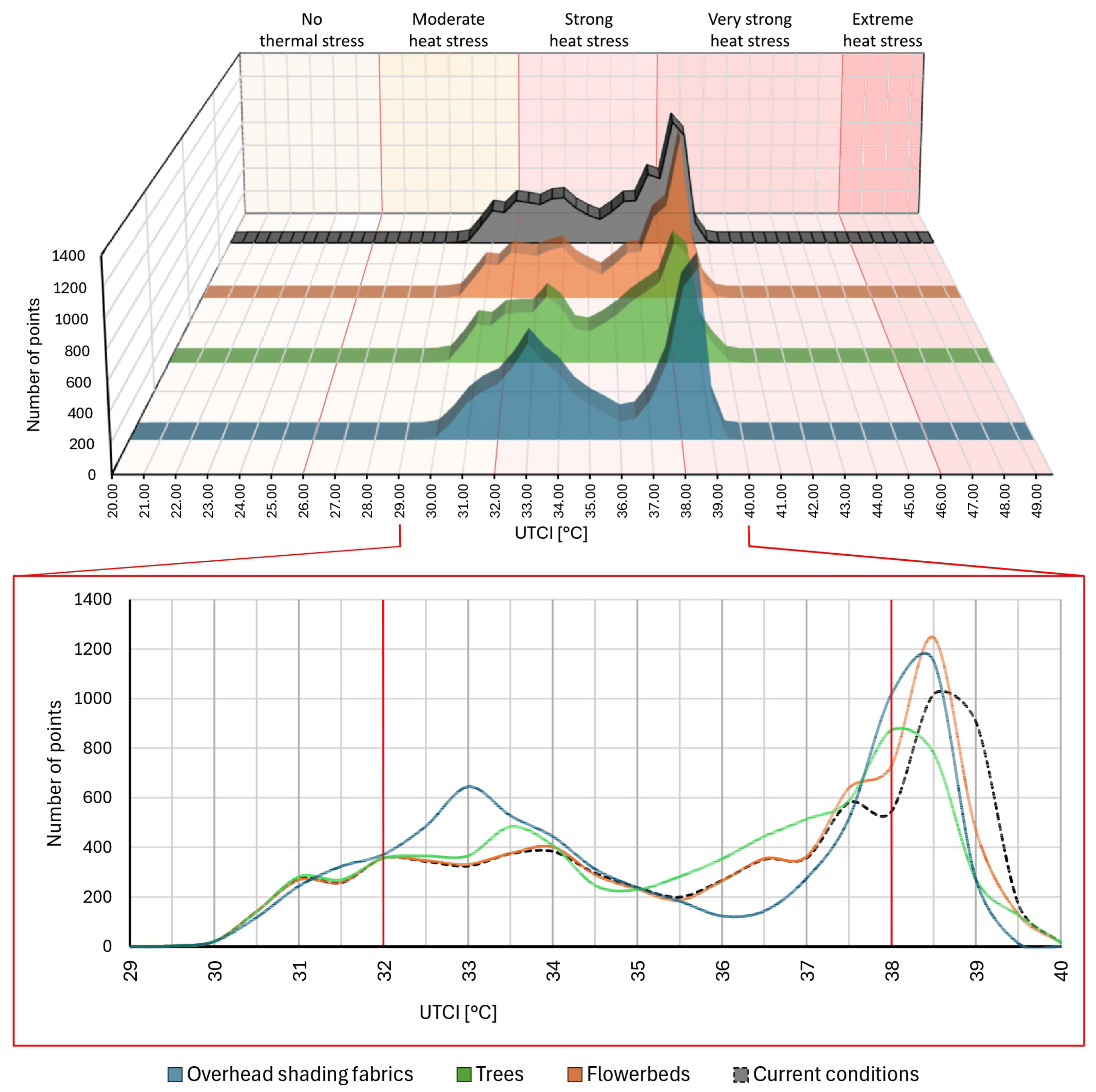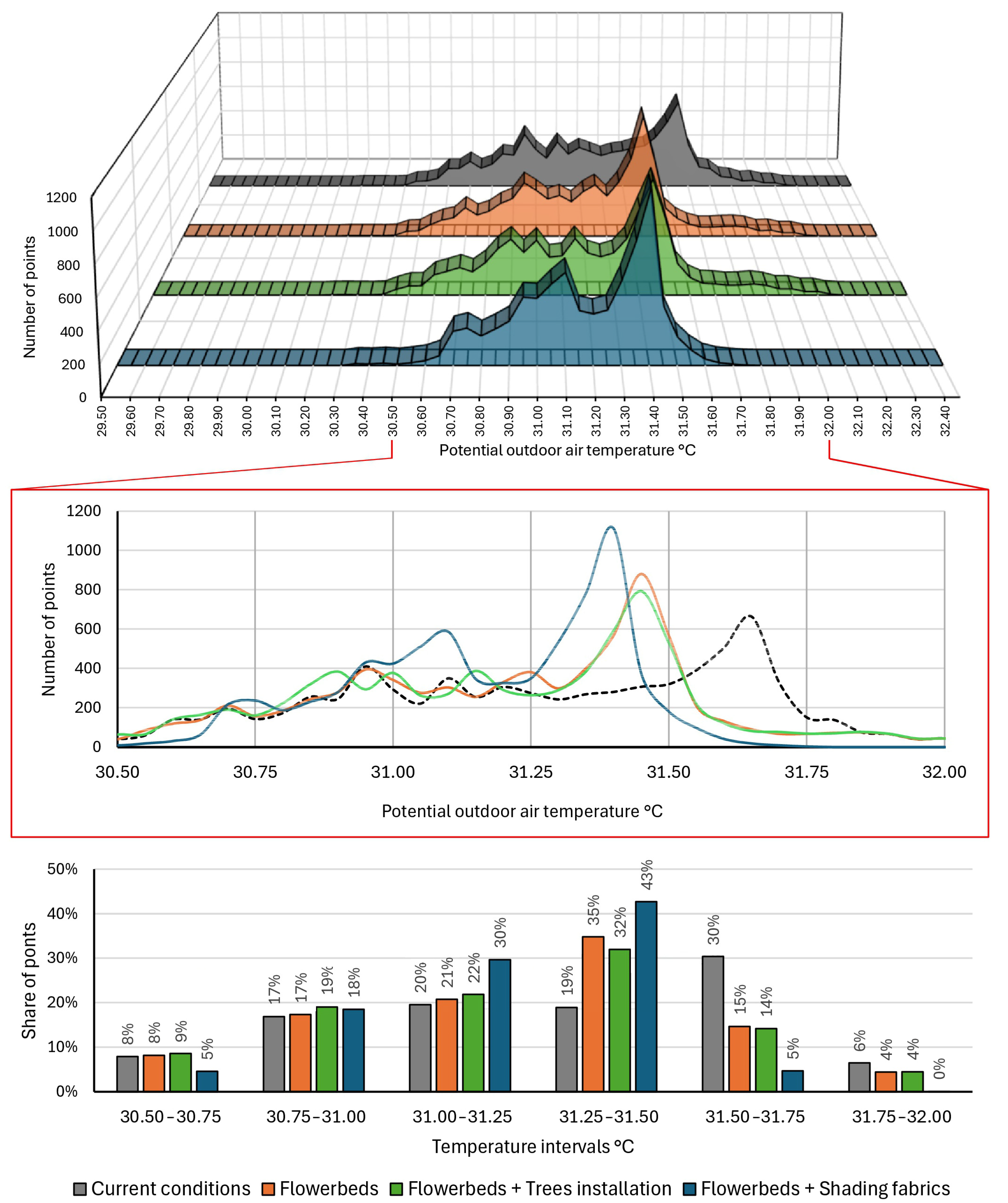 Figure 7. Compared to the “Current conditions” (black dashed line), all mitigation strategies effectively shift the temperature distribution towards lower values. The “Flowerbeds” and “Flowerbeds + Trees installation” strategies visibly reduce the peak occurrence of higher temperatures and increase the frequency of cooler points. For instance, “Flowerbeds + Trees installation” reduces the share of points in the 31.50–31.75 °C interval from 30% to 15% and increases the share in the 31.25–31.50 °C range from 19% to 35%. However, these greening strategies are characterized by similar effectiveness in terms of average air temperature.