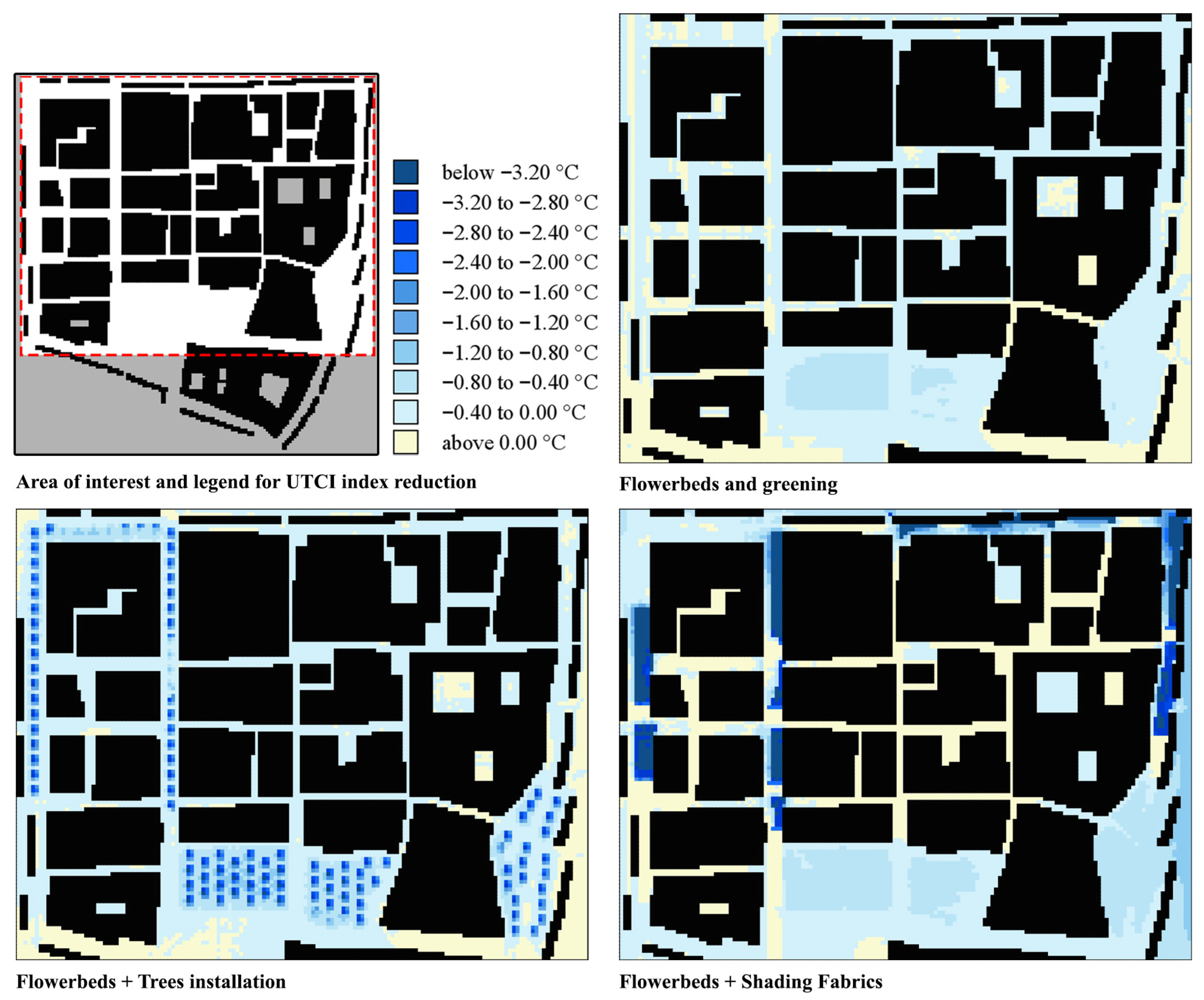 Figure 8 provides a graphical visualization of these results. Spatially, the “Flowerbeds + Shading Fabrics” scenario stands out as the most effective, demonstrating extensive UTCI reductions across the delineated area of interest, with reductions extending below −3.20 °C in numerous locations, indicating a broad cooling effect especially across streets. “Flowerbeds + Trees installation” also yields significant localized improvements, particularly evident in the concentrated areas of tree planting, demonstrating the efficacy of vegetation in ameliorating microclimate conditions. In contrast, the “Flowerbeds and greening” strategy, while contributing positively, shows more modest and less pervasive reductions, primarily confined to the vegetated portions.