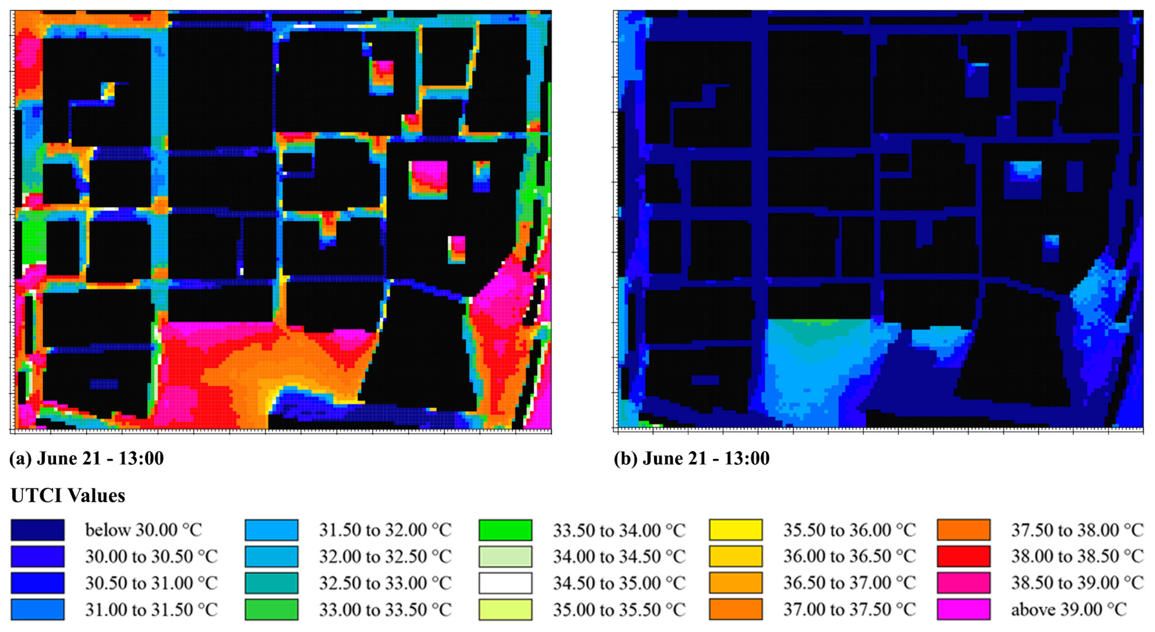 Figure 10, allow us to assess extremely different scenarios. As demonstrated by making reference to the UTCI mapping, on 21 September the heat stress registered is, on average, below the threshold of moderate levels, with the only exceptions being localized in the Piazza della Signoria perimeter. These results allow us to foresee the opportunity to remove the mitigation solutions for this month, as their presence would ensure only marginal gains, considering also that the average air temperature is in this case about 24 °C. On the other hand, the June scenario exhibits the same heat stress trend highlighted in the case of July simulations: once again the open paved squares emerge as particularly critical (Ta ~31 °C, UTCI above 35 °C), while the narrow medieval streets act as climate shelters.