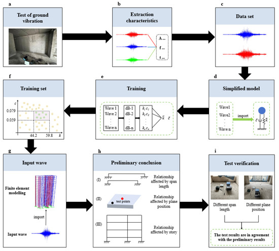 Methodology using machine learning for the regularity of metro-induced maximum vertical vibration levels. The collected vibration data are shown in (a). Key characteristics were extracted from field-measured vibration data, including frequency (f), amplitude (A), and effective vibration duration (t) (b). The remaining data are marked as “Good” and retained to form the final dataset (c). As depicted in Figure 2, the vibration propagation process from measurement point M to measurement point T is simplified using a single-degree-of-freedom system model (d). The arithmetic average of all stiffness and damping values is calculated to determine the average stiffness () and average damping () for the hypothetical single-degree-of-freedom system (e). Data falling outside these ranges were eliminated (f). The filtered vibration data were then averaged using a weighted approach to obtain the input data required for the finite element model (g). A finite element simulation was subsequently conducted to investigate the effects of factors such as span, vertical height, and structural components on the maximum vertical vibration levels (h). Validation was conducted through on-site vibration tests (i).