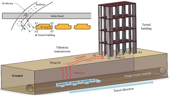 The vibrations induced by the metro are transmitted to the foundations through the ground, resulting in noise pollution that has become a significant social concern [1,2,3]. The criteria for evaluating vibration comfort, especially the selection of measurement points, vary significantly across different countries [4,5]. Nevertheless, the position of measurement points has resulted in social conflict, with complainants frequently asserting that the inaccurate position of measurement points fails to reflect the maximum vertical vibration levels. This issue is closely related to the broader agenda of sustainable urban development. Metro systems represent a cornerstone of low-carbon and energy-efficient urban transportation. However, if vibration-induced discomfort is not properly addressed, it may reduce public acceptance of metro projects, generate social conflicts, and even lead to costly retrofitting of buildings.