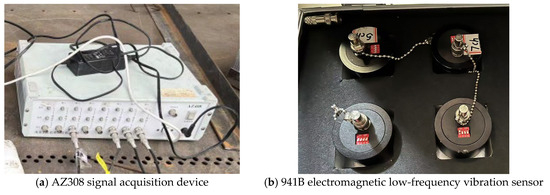 The instrumentation used included acceleration sensors and signal acquisition device. The signal acquisition device utilized was the AZ308 Signal Acquisition Device (Nanjing, China, An Zheng Software Engineering Co., Ltd.), as shown in Figure 3a, which has a sampling frequency of 512 Hz and an analysis frequency of 200 Hz. The acceleration sensor used was a 941B electromagnetic low-frequency vibration sensor (Beijing, China, Tengsheng Qiaokang Technology Co., Ltd.), shown in Figure 3b, which was affixed to the measurement point with adhesive. The sensor has a resolution of 5 × 10−6 m/s2, a sensitivity of 0.3 V/m/s2, and a maximum acceleration range of 20 m/s2. The performance of the instruments meets the requirement of [22]. All instruments are certified prior to their use.