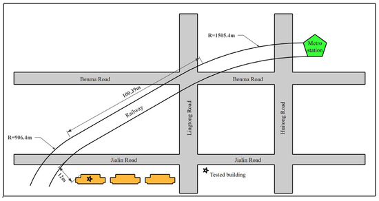 The on-site measurements were conducted in Nanjing, China, a city covering an area of 6587.02 square kilometers and with a population of approximately 9.49 million. The metro system serves as a vital mode of public transportation within the city. The test site was situated on the southern side of Jialing Road, between Jinma Road Station and Huitong Road Station on Metro Line 4.