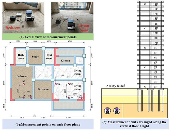 A photograph of the measurement points is shown in Figure 5a. As illustrated in Figure 5c, measurements were conducted on the 1st, 5th, 9th, 13th, and 18th floors. The measurement points were strategically located at key structural positions on each floor, including the corners of shear walls, areas near columns, the mid-span of beams, and the center of slabs, as shown in Figure 5b. To assess the effect of beam span on metro vibration transmission, measurement points N1 and N4 were selected. Similarly, to evaluate the influence of slab span points N3 and N7 were placed at the centers of slabs with different spans. Measurement point N6 was positioned near a column, while points N2 and N5 were located at the corners of shear walls. This arrangement was designed to analyze the influence of different structural components on vibration transmission.