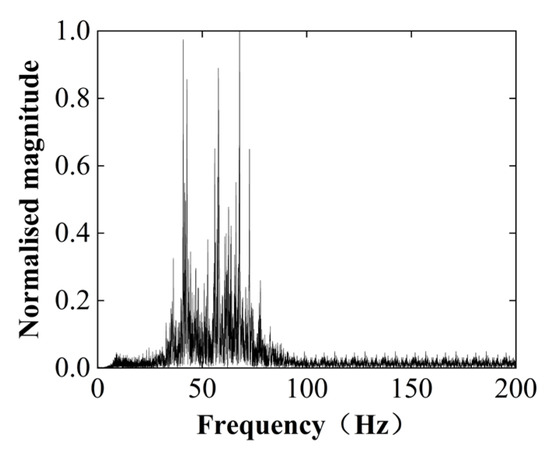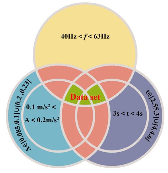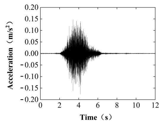 The criteria for selecting the dataset and training set are illustrated in Figure 6 and Figure 7. The stiffness and damping values of the equivalent single-degree-of-freedom system used in the training set are provided in Table 3. The average stiffness () and damping () values were 52 kN/mm and 0.069 kN·s/mm, respectively. The vibration data obtained through machine learning were processed using a weighted average derived from the training set. The resulting vibration acceleration curve is presented in Figure 8, while the corresponding acceleration spectrum is shown in Figure 9. The duration of the vibration, as obtained by machine learning, is 3.67 s. The peak acceleration is 0.177 m/s2, occurring at a peak frequency of 68 Hz. The energy distribution is relatively concentrated, with the majority of the energy occurring between 34 Hz and 78 Hz.
