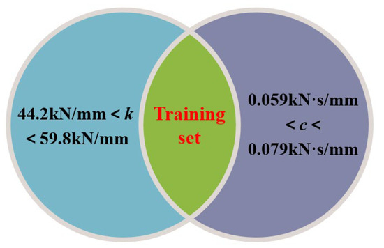 The propagation path between Measurement Point M and Measurement Point T is influenced by various time-varying parameters, leading to the occurrence of anomalies. To identify the data affected by environmental factors, a supervised learning model is employed in this study. A total of 560 sets of vibration data from measurement points A1 to A5 and measurement point M were collected. 60 sets of data among these were selected to construct a dataset for the determination of vibration parameters in the propagation path by inversion, while the remaining 500 datasets were used as a training set to identify and remove anomalous data. As depicted in Figure 2, the vibration propagation process from measurement point M to measurement point T is simplified using a single-degree-of-freedom system model (Figure 1d). It should be noted that the propagation path from measurement point M to T was simplified into a single-degree-of-freedom (SDOF) system for parameter inversion. This simplification was adopted to enable efficient identification of equivalent stiffness and damping values and to facilitate the integration of machine learning for anomaly detection. However, the actual foundation-structure system exhibits multi-degree-of-freedom (MDOF) behavior with complex modal interactions. Consequently, the SDOF assumption may neglect higher-order vibration modes and localized responses, introducing potential discrepancies between the simplified model and the real structural behavior. Therefore, the SDOF-based results should be regarded as approximate representations rather than exact characterizations of the system. From the 60 selected vibration datasets, the data from measurement point M served as input, while the data from measurement point T served as output. Structural parameter identification and inversion are then employed to derive the stiffness (k) and damping (c) corresponding to each dataset. Subsequently, the arithmetic average of all stiffness and damping values is calculated to determine the average stiffness () and average damping () for the hypothetical single-degree-of-freedom system (Figure 1e).