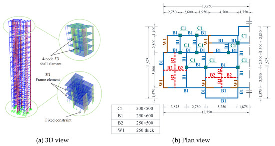 SAP2000 (Beijing Construction Information Solution Engineering Consulting, Beijing, China) was selected to conduct the finite element analysis. The ground floor, assumed to be fixed, was designated as the model boundary, as shown in Figure 10. Beams and columns were modeled using elastic 3D frame elements, while shear walls and floor slabs were modeled using elastic 3D shell elements. All beams and columns have rectangular cross-sections, with dimensions provided in Figure 10b. The structural components are assumed to be rigidly connected. The concrete strength is 30 MPa, and the slab thickness is 100 mm.