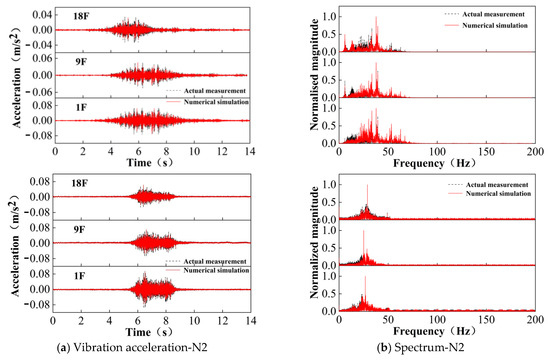 To validate the model, field measurement data from measurement points N2 and N6 on the first, ninth, and eighteenth floors were compared with the simulation results. The vibration acceleration time-history curves and their corresponding spectral graphs are presented in Figure 11. The simulation results for measurement points N2 and N6 show a high degree of consistency with the actual measurements. However, the measured values are slightly higher than the simulated ones, likely due to a minor amplification effect induced by external environmental factors. As shown in Table 5, the relative error between the simulated and measured values is less than 3%, indicating that the finite element analysis model is both accurate and suitable for further studies on the vibration comfort of buildings located near metro lines.