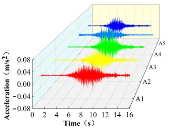 Metro-induced vibrations are time-varying in nature. Therefore, the vibration signals were processed in accordance with the guidelines established by the U.S. Federal Transit Administration (FTA). The Fast Fourier Transform (FFT) was subsequently applied to analyze the frequency domain of the metro vibration signals. The time-domain vibration acceleration data were processed using one-third octave band analysis in Matlab 2020b to obtain the effective vibration acceleration. Subsequently, the vibration acceleration level was calculated according to Equation (1) [23].