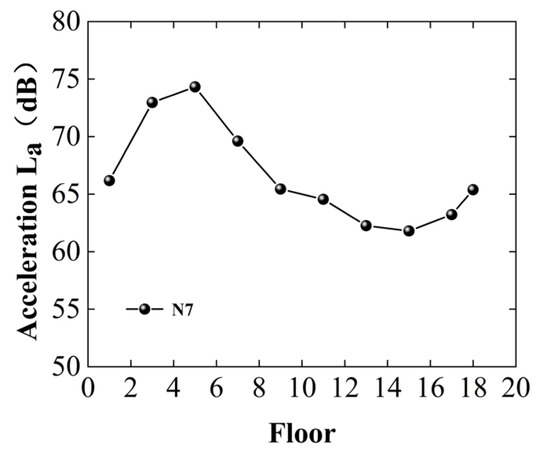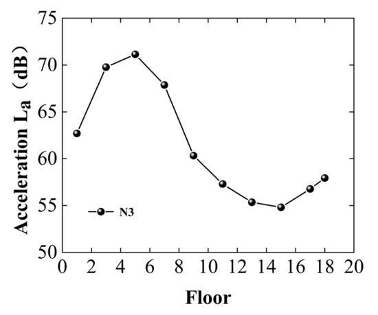 The 1/3 octave vibration levels at 31.5 Hz for measurement points N3 and N7 are shown in Figure 14 and Figure 15. It can be observed that the 1/3 octave vibration level initially increases with height, reaching a peak at the 4th floor, after which it gradually decreases. An increase in vibration levels is also observed on the 17th and 18th floors, likely due to the amplification of the vertical vibration acceleration caused by the amplification effect at the top of the building.