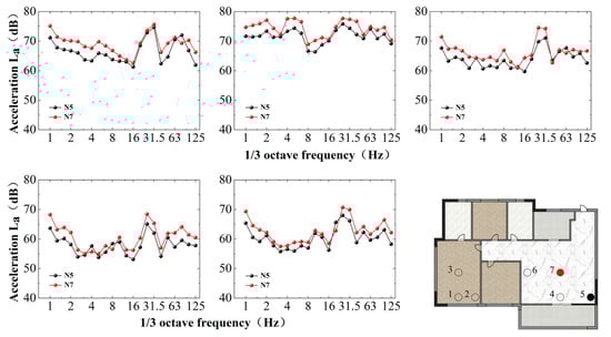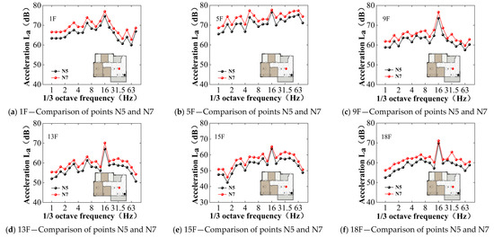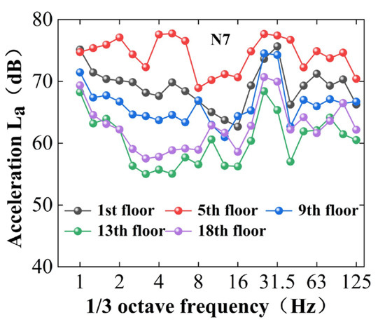 Figure 16 presents a comparative analysis of the 1/3 octave vibration levels between measurement points N5 and N7 on each floor.