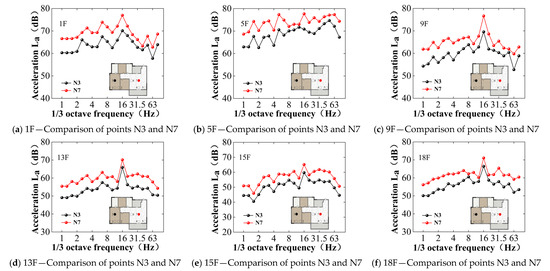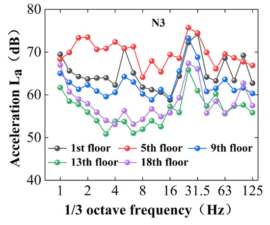 Figure 17 presents a comparative analysis of the 1/3 octave vibration levels between measurement points N3 and N7 on each floor. The results show that the 1/3 octave vibration levels at point N7 are higher than those at point N3, indicating a positive correlation between the building’s vibration levels and the span length. This suggests that as the span length increases, building vibration also intensifies.