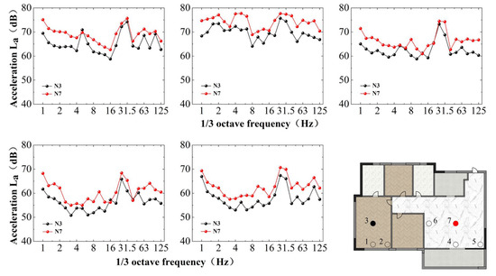 The results indicate that the 1/3 octave vibration levels at point N7 are higher than those at point N5, suggesting that the vertical vibration levels near the shear walls are lower than those in the floor slabs. This indicates that, as a relatively flexible component, the floor slab should be the primary focus.
