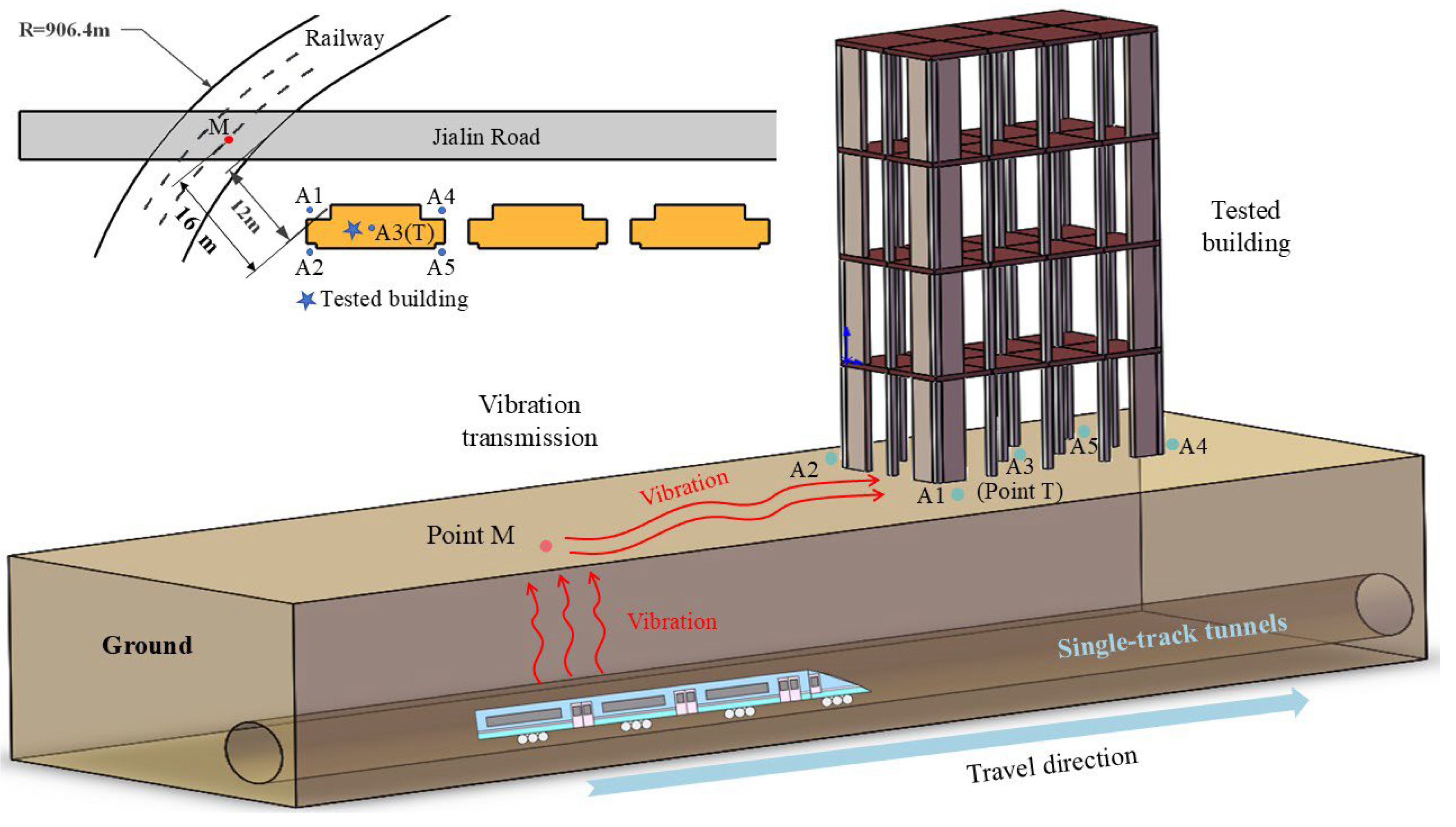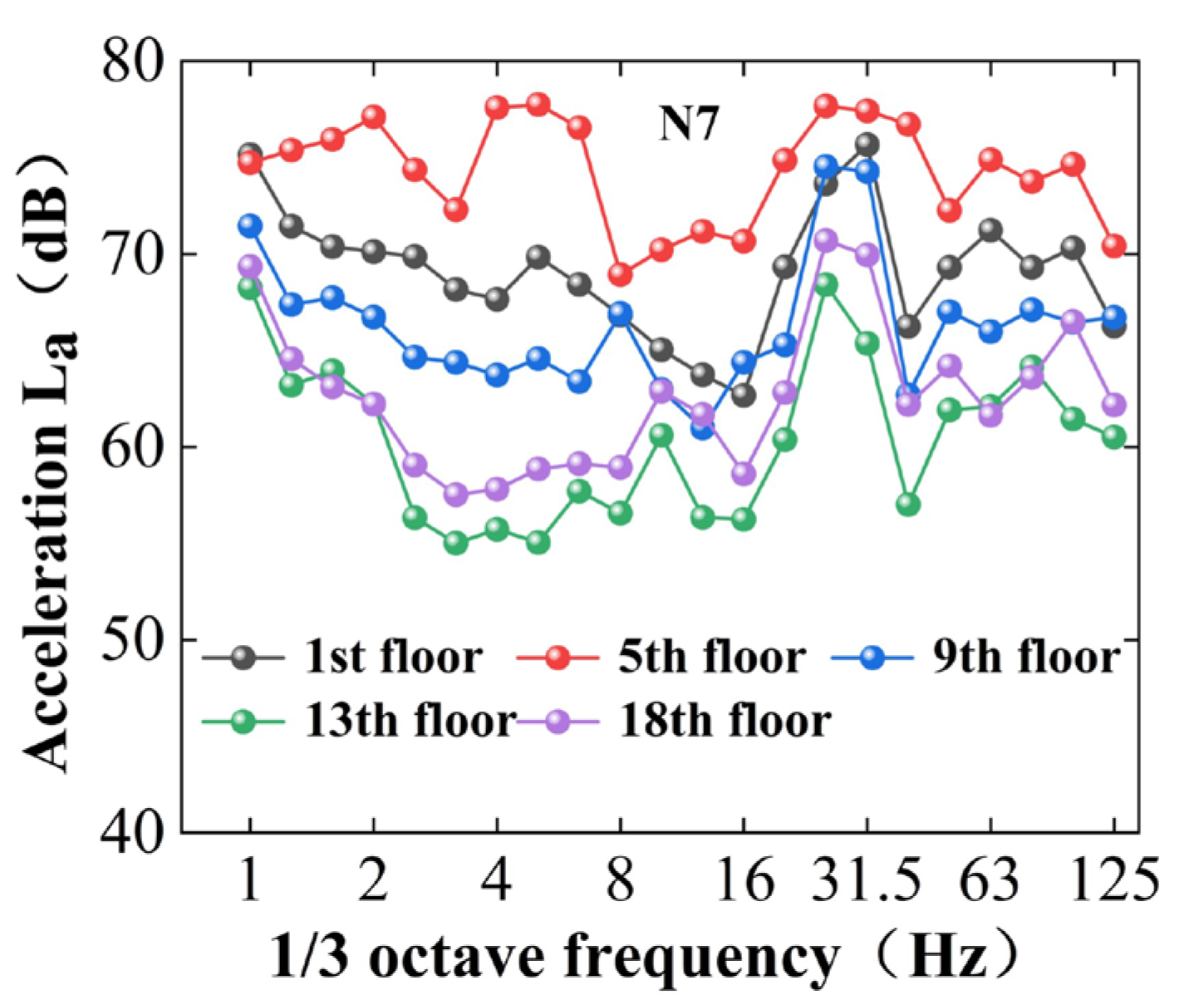- Different structural components exhibit varying maximum vertical vibration levels within the same floor. Compared to shear walls, floor slabs have a more significant effect on vibration levels. Vibration levels are higher at the center of the slab than at the edges. Furthermore, the effect of metro-induced vibrations on buildings is strongly correlated with the span length of structural elements, with larger span elements exhibiting more pronounced vibration levels at their measurement points. For critical structural points, targeted renovations should be implemented to extend the building’s service life. This is key to creating a city that conserves resources.