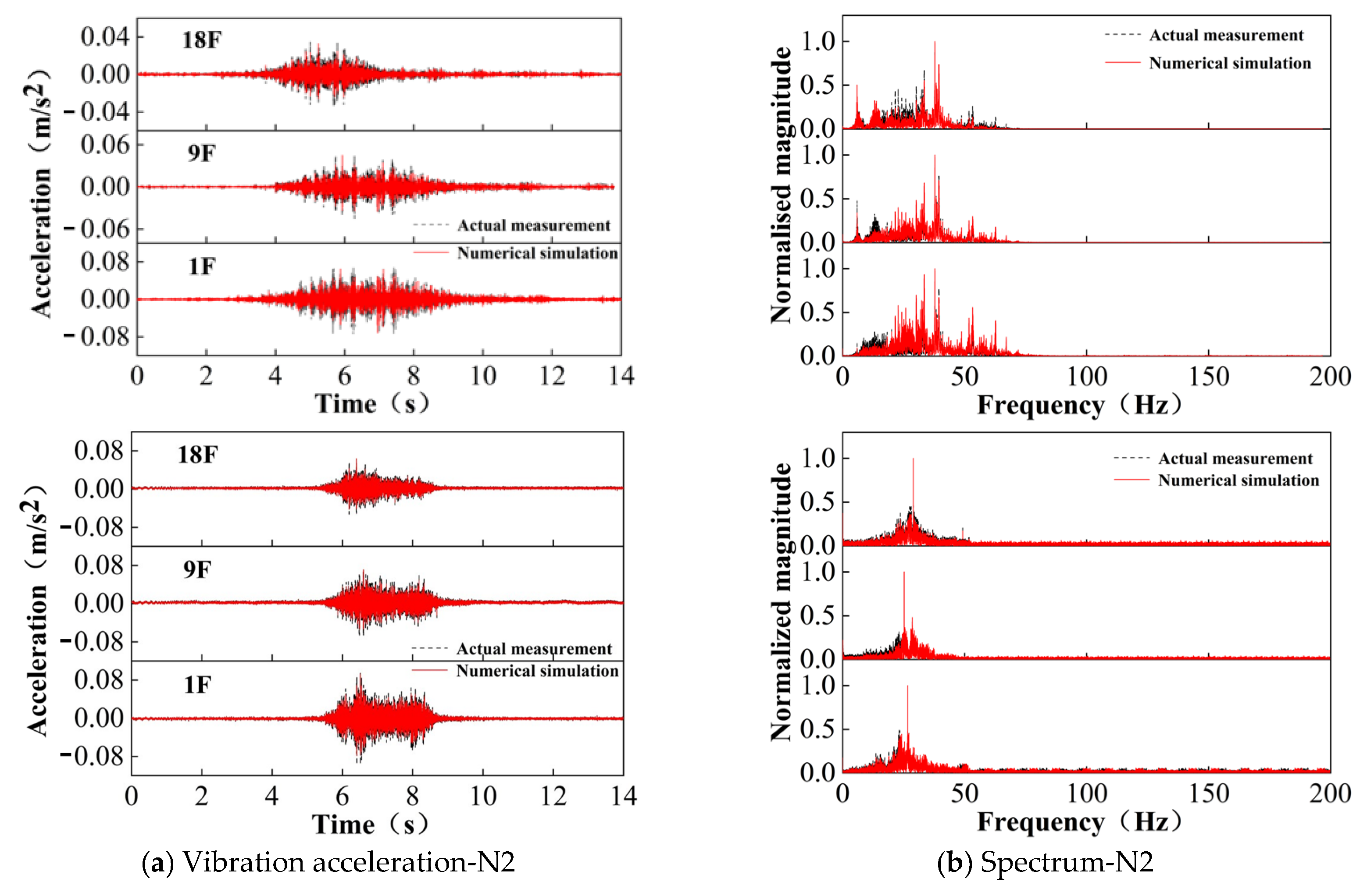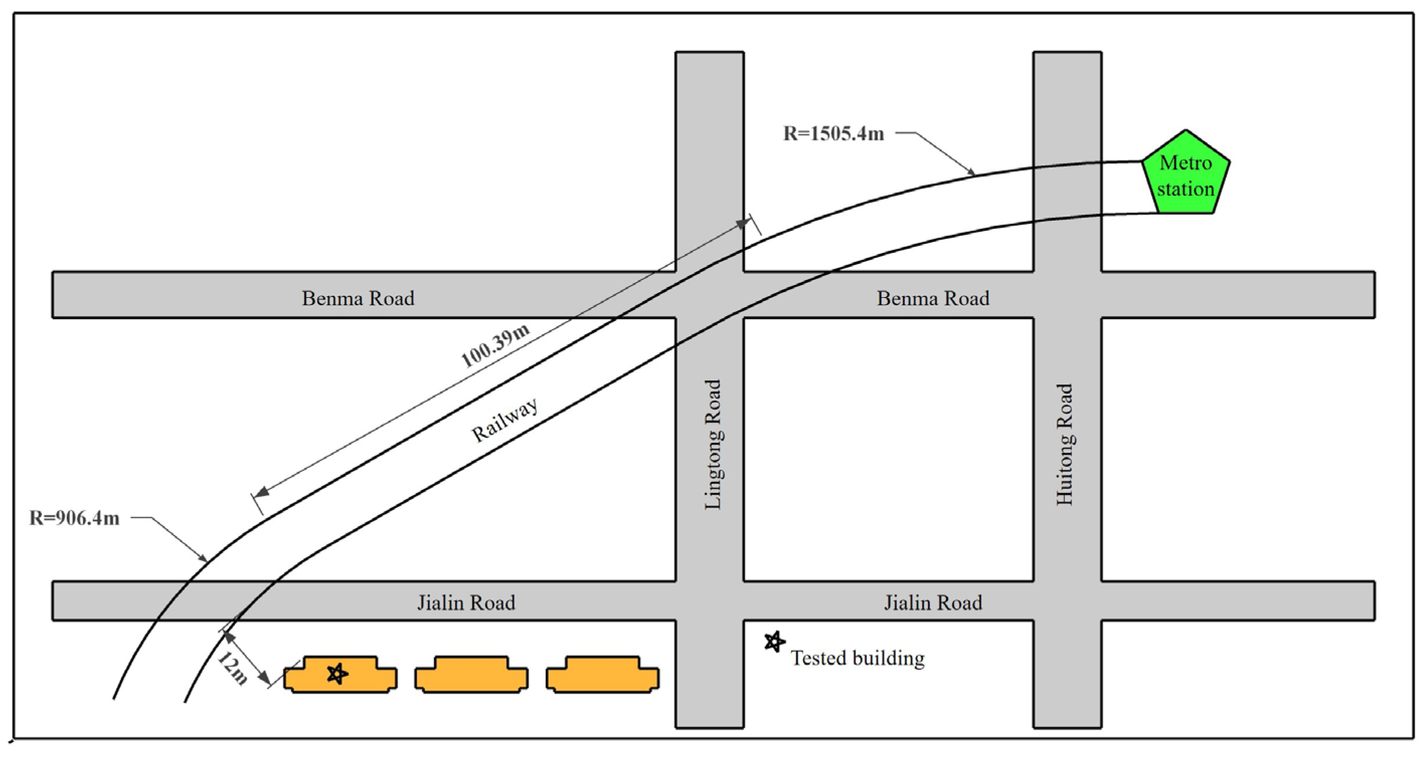 - Chen, Z.; Wan, F.; He, C. Field Test and Numerical Study of Train-Induced Vibration of Over-Track Buildings Above Metro Depot. Urban Rail Transit 2024, 10, 361–375. [Google Scholar] [CrossRef]