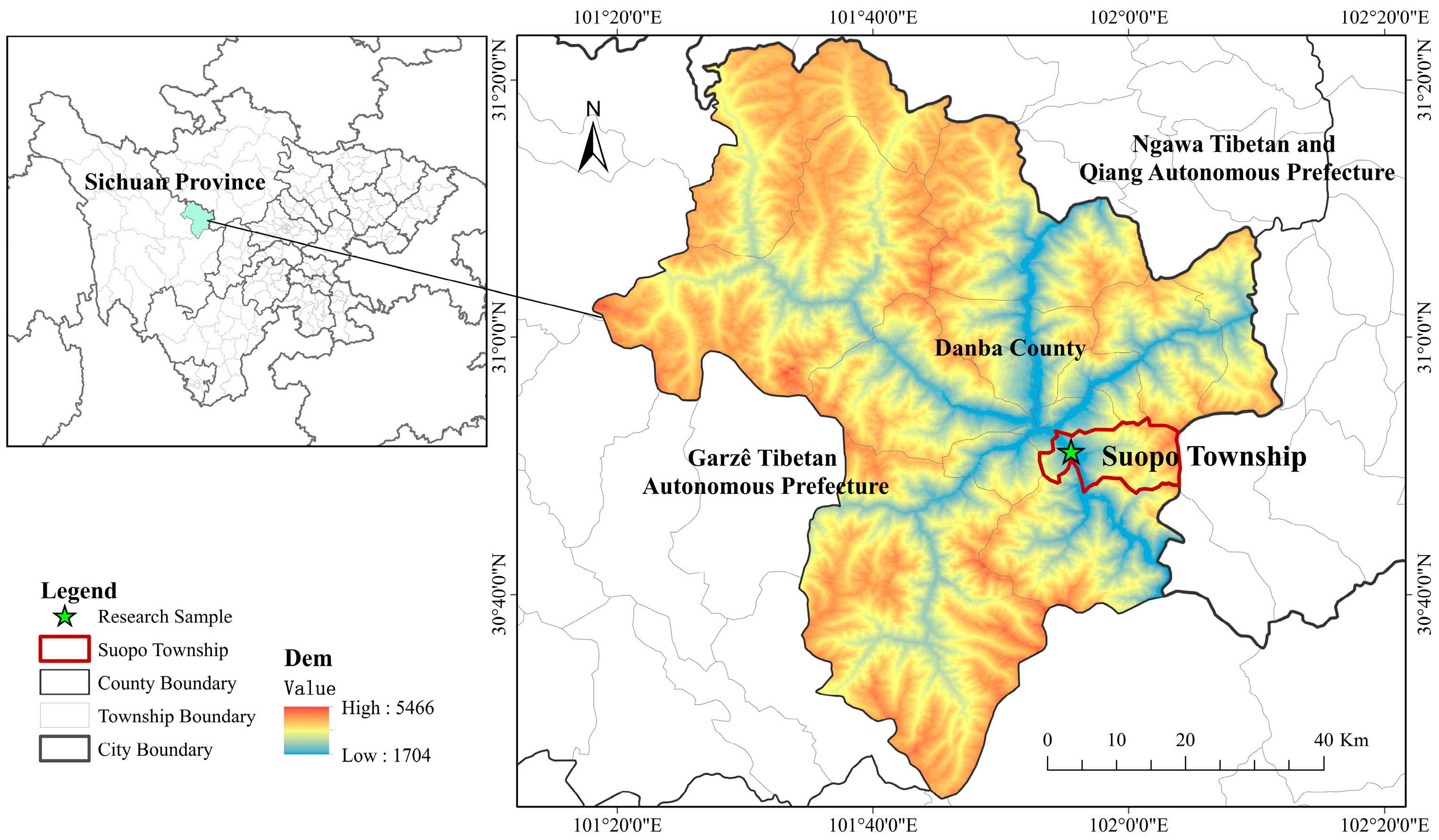 Suopo Township lies in eastern Danba County, Garze Tibetan Autonomous Prefecture, Sichuan, nestled between the Dadu River Valley and snow-capped peaks at 1800–3200 m (Figure 1). Its distinct vertical climate zones exemplify the high-mountain gorges of the Hengduan Mountains. In Tibetan, “Suopo” means “Mongols”, recalling the Mongolian herders who once grazed here. During the Tang Dynasty, this region formed the heartland of the “Eastern Women’s Kingdom,” traces of which still endure. Today, Suopo preserves 172 ancient watchtowers—the densest concentration in China and beyond—listed as national key cultural relics in 2006 and attracting sustained government and academic attention.
