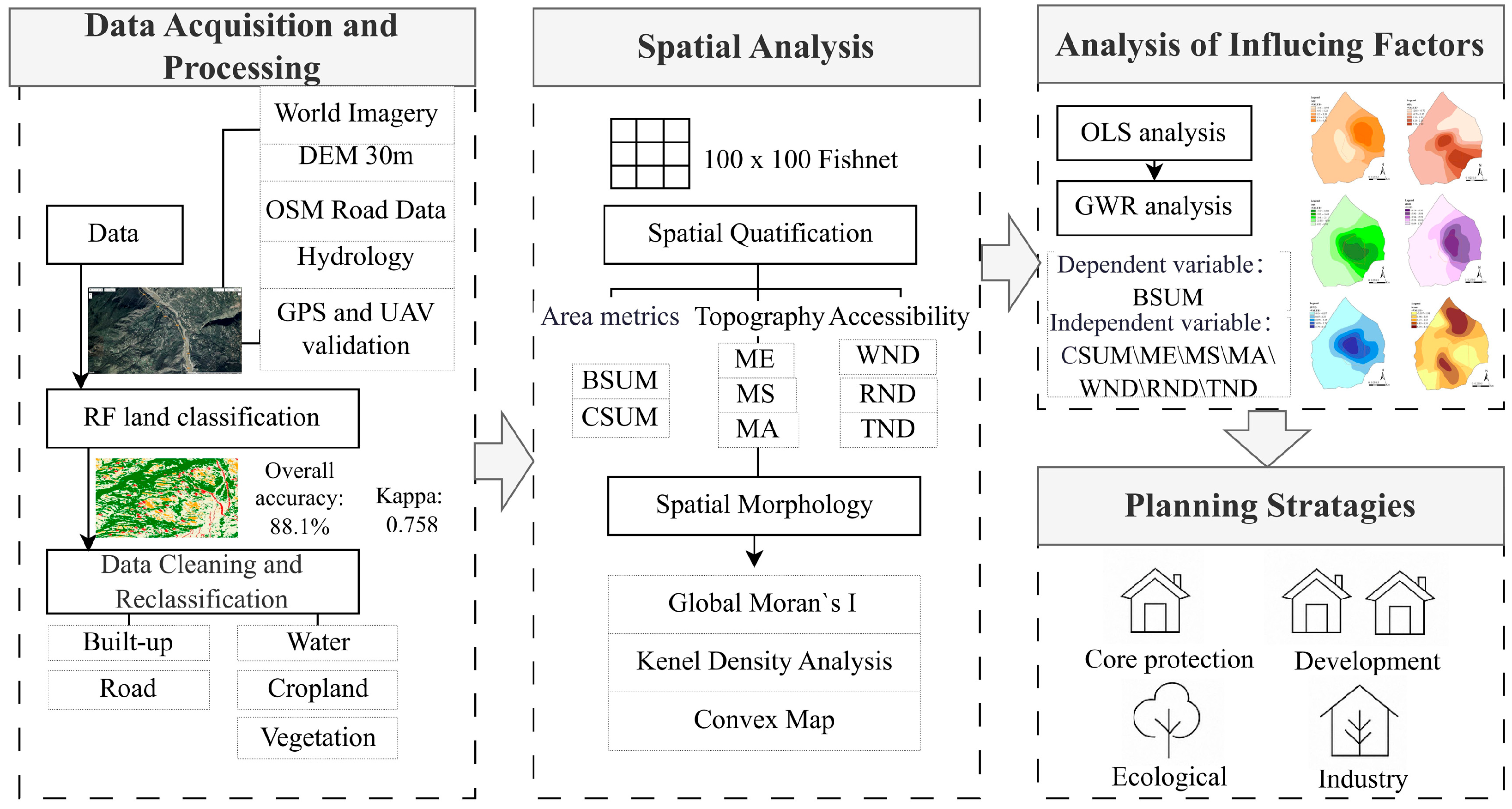 This study employed a four-step framework. First, high-resolution imagery, DEM, OSM road and hydrology data, and UAV/GPS surveys were collected. Land-use types were classified using a Random Forest algorithm, reclassified, and validated. Second, a 100 × 100 m fishnet grid was used to quantify built-up and cropland areas, topographic factors (elevation, slope, aspect), and accessibility to water, roads, and towers. Third, spatial patterns were analyzed using Moran’s I, kernel density estimation, and convex mapping. Finally, OLS and GWR models identified the main driving factors, providing the basis for planning strategies (Figure 2).