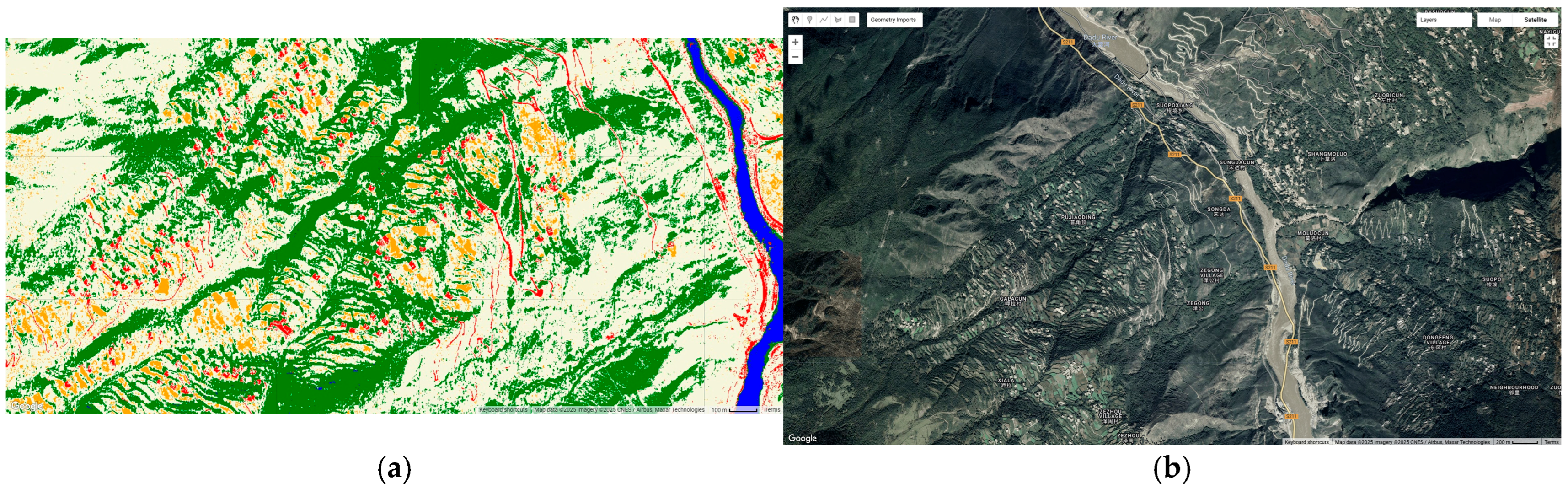 Figure 3. Extraction of high-resolution imagery and land classification in the study area. (a) RF land classification of sample villages; (b) Google high-definition imagery of sample villages.